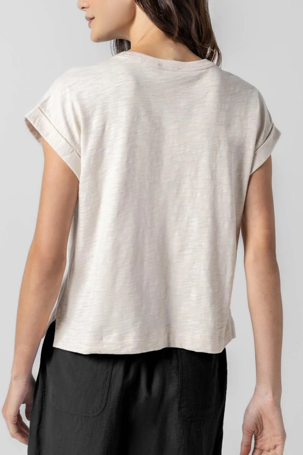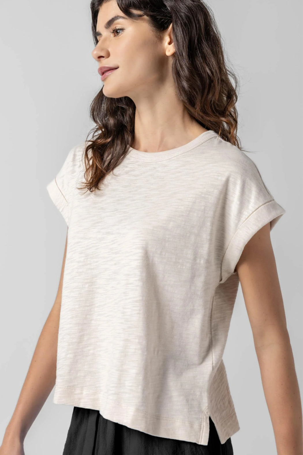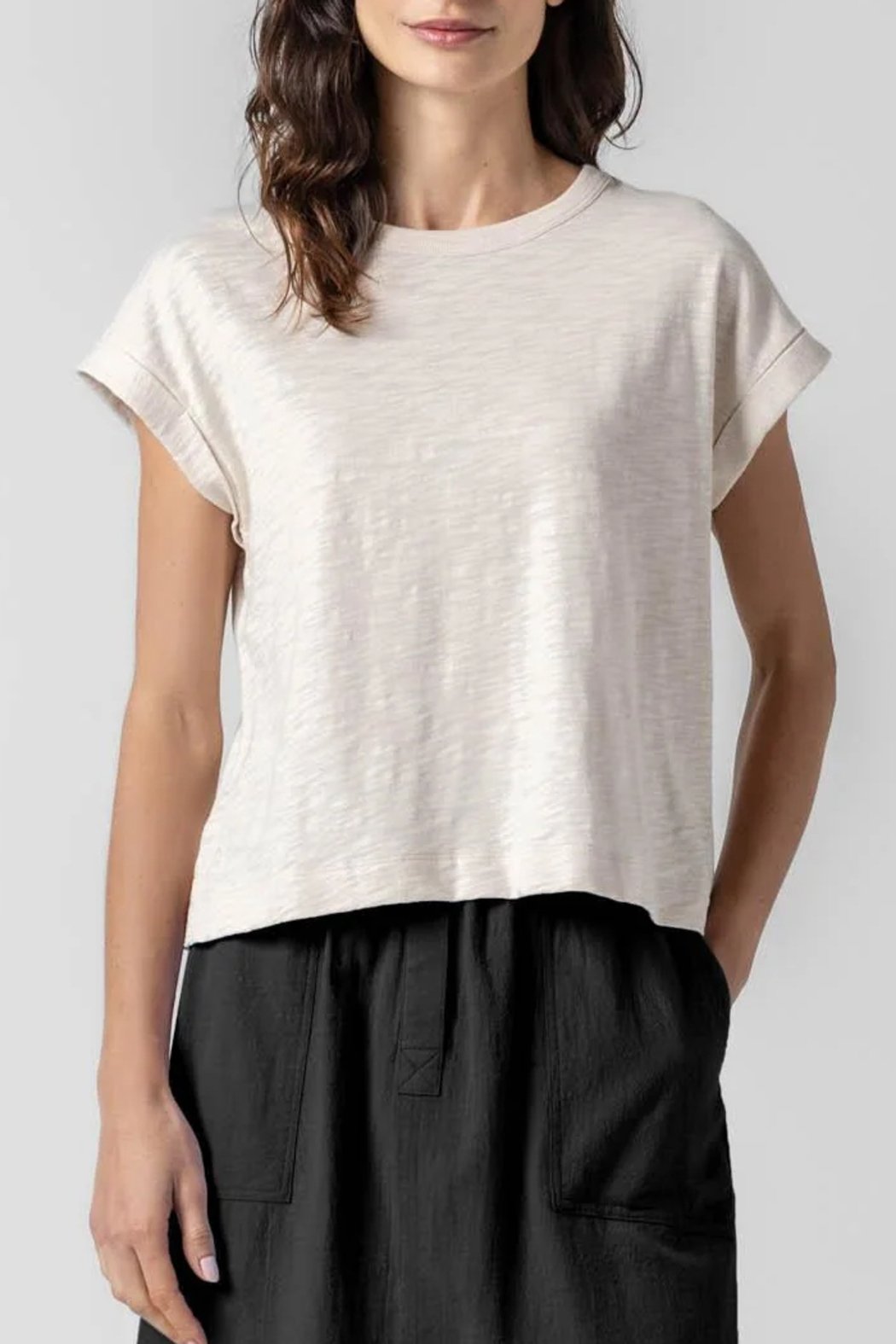 Our Sleeveless Boxy Crewneck in our 100% cotton Loose Knit Slub fabric offers a modern shape with effortless simplicity. Designed with extended sleeves and tacked cuffs, this tee has side slits at the hem for subtle detail. The slightly shorter body length and boxy fit create an effortlessly chic silhouette, making it a versatile piece for your warm-weather wardrobe.