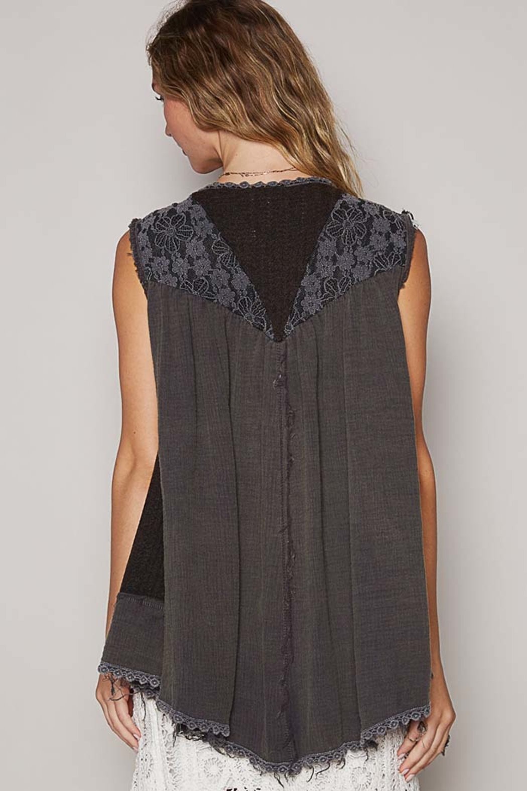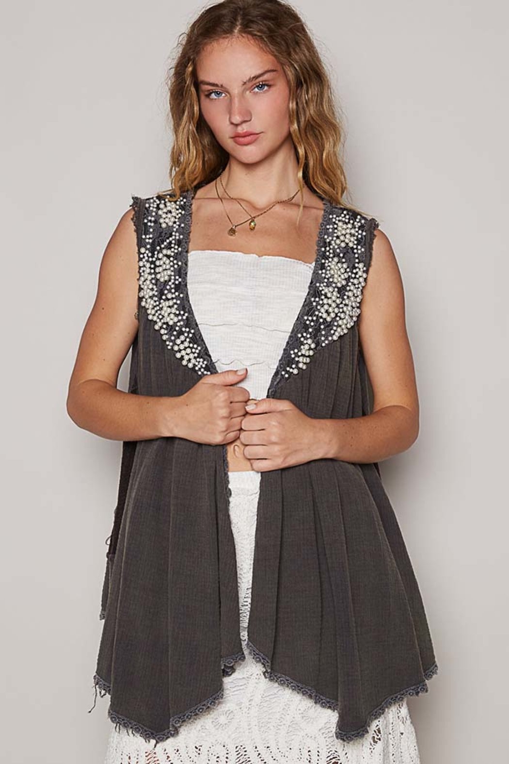 Designed in sleeveless open front woven layering cardigan top, roomy fit in double gauze and sweater fabrication mix with embroidered pearl details and frayed edge hems.
