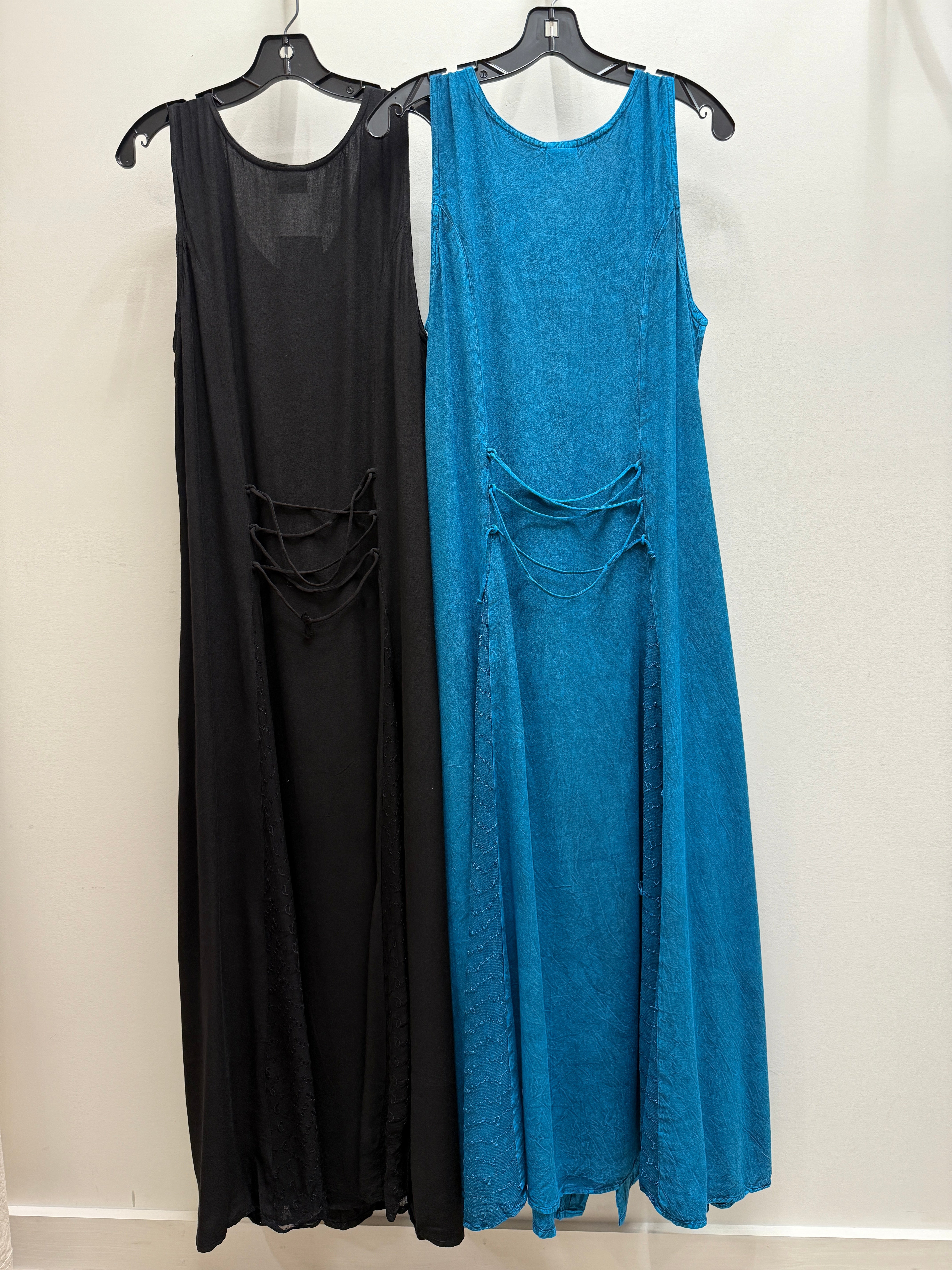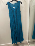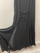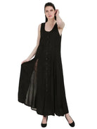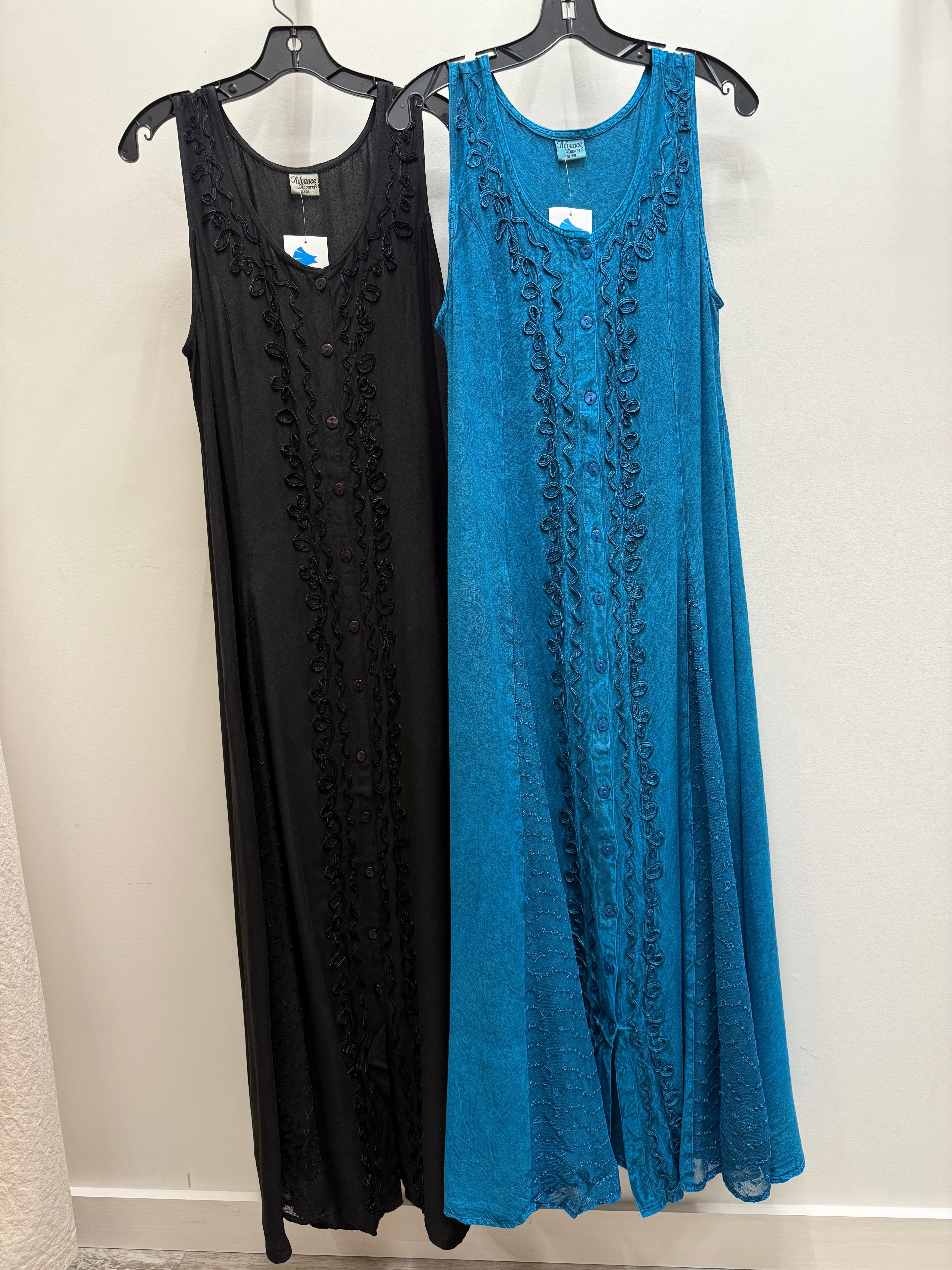 This button down trapeze dress features ankle-length and corded embroidery lace detailing, along with sheer lace skirt insets. The vertical seamline structure creates an elongating, flattering effect throughout the body. Perfect for the Renaissance Boho style lover, it can be worn alone or layered for a unique look.