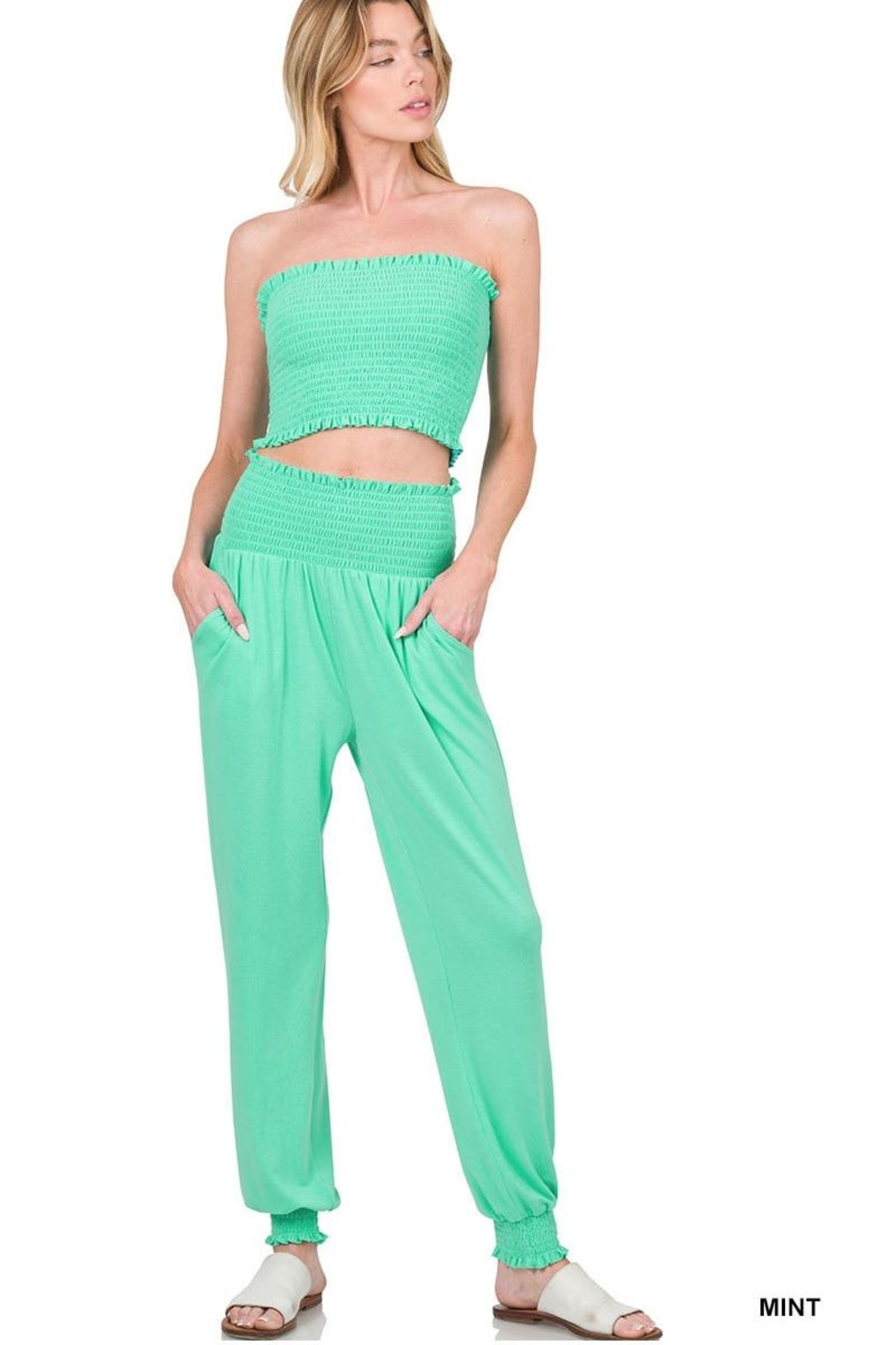 Smocked Tube Top & Jogger Pants Smocked Waist & Cuffs Pleated Pants Lounge Set Mint
