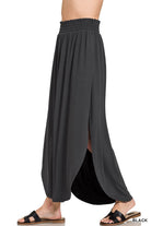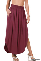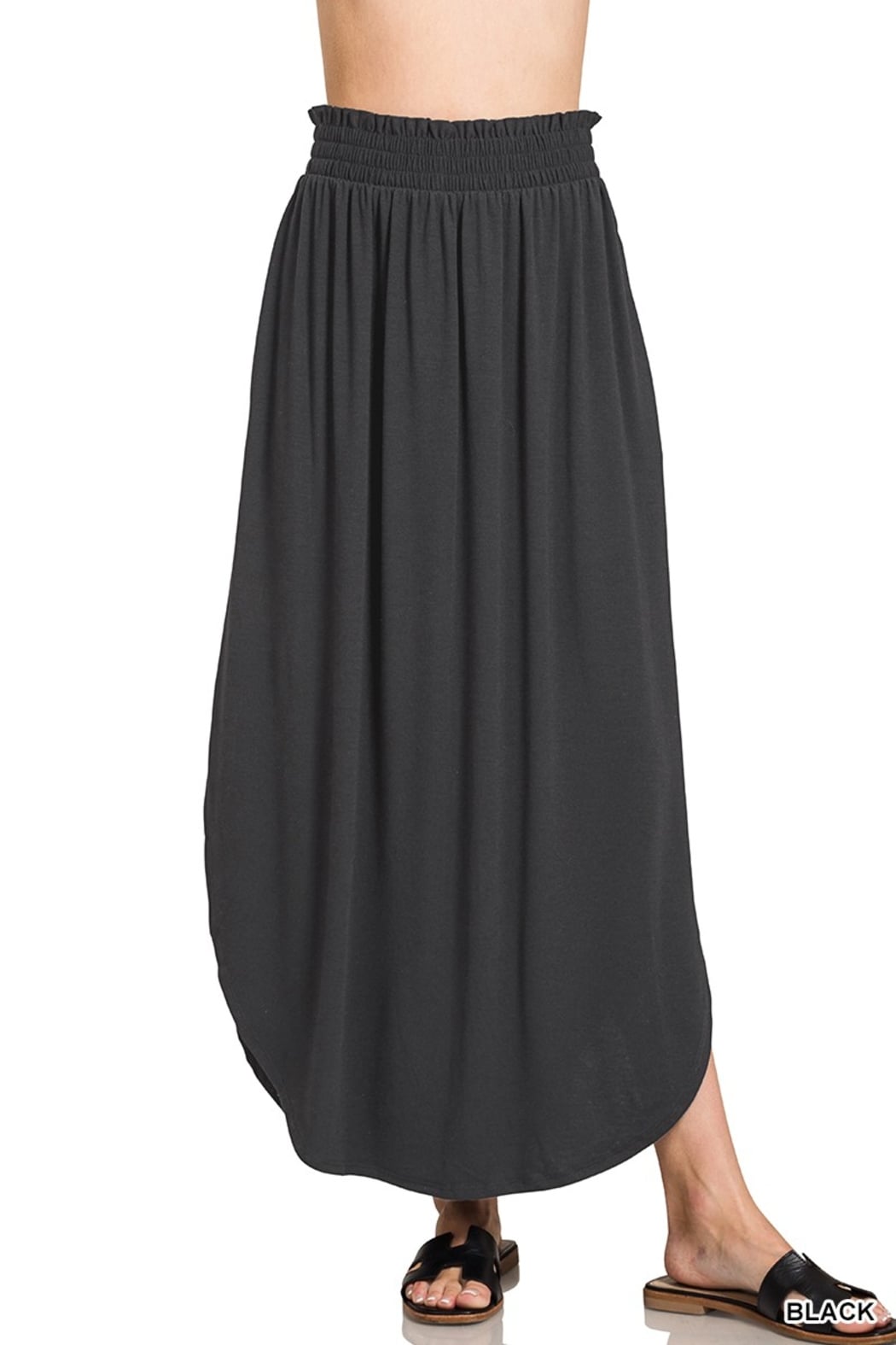 A breezy smocked waist maxi skirt in a soft, drapey jersey knit for everyday wear. The Smocked Waist Maxi Skirt features gathered detailing at the elasticized high waist and a relaxed A-line silhouette that skims the ankle. It's an easygoing piece for casual days, travel, or warm-weather errands, styled here with flat sandals to emphasize a laid-back vibe.