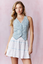 Sparkle Charm Denim Vest Add a touch of glam to your casual look with the Sparkle Charm Denim Vest. This classic denim piece gets a dazzling upgrade with an intricate rhinestone bow pattern on the back, blending rugged style with playful elegance. Perfect for layering over dresses or tees, it brings eye-catching detail to any outfit while keeping your look effortlessly cool.