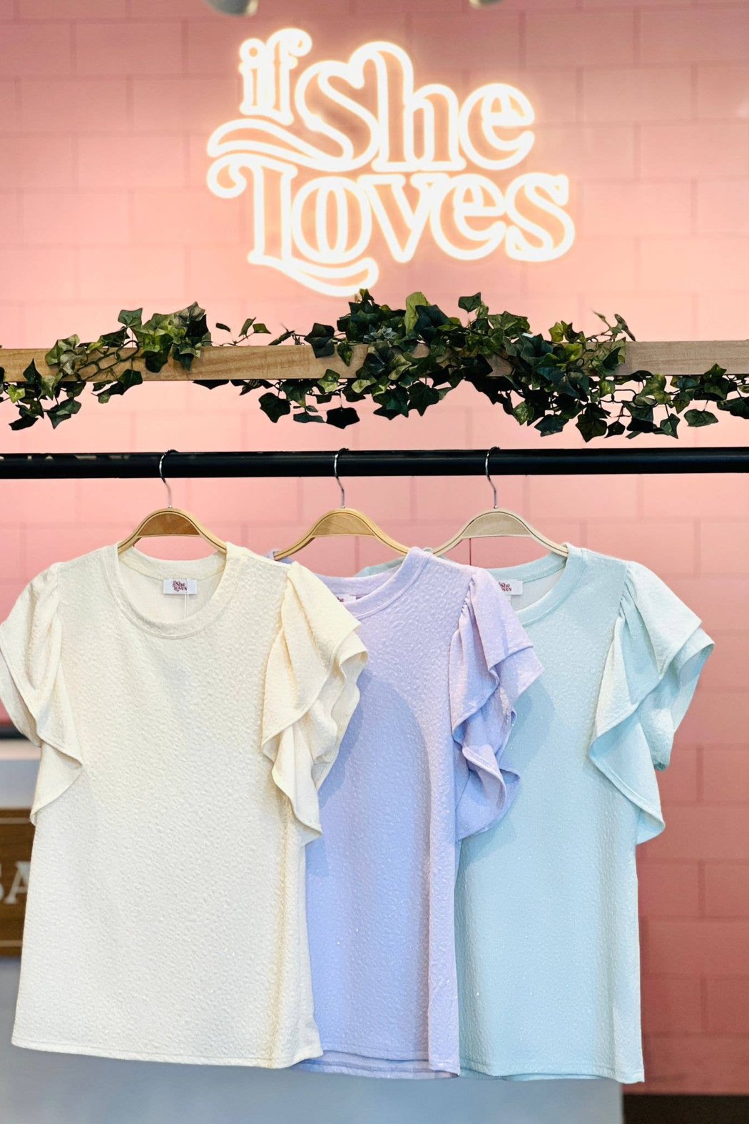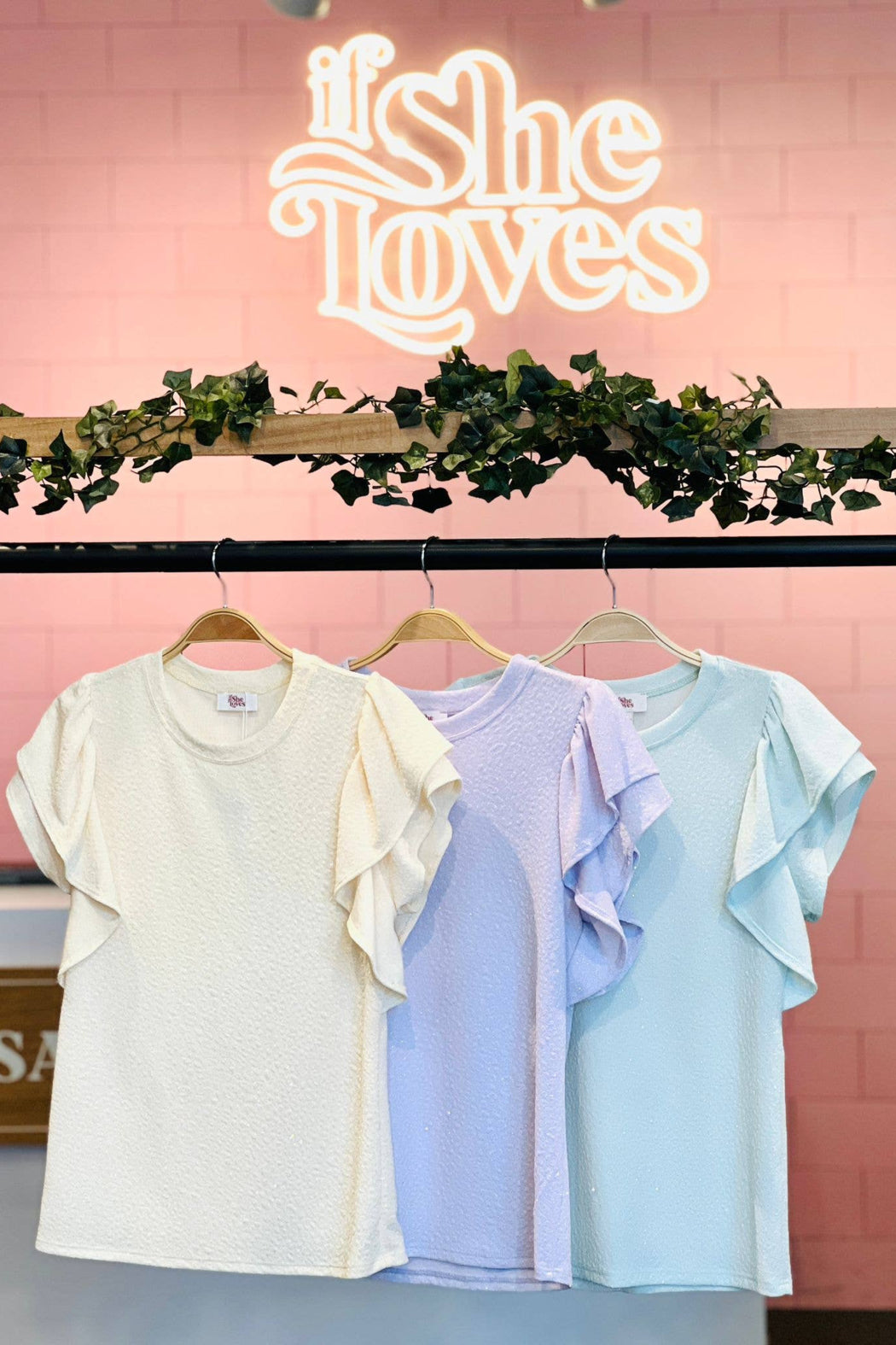 A feminine sparkly blouse with layered ruffle sleeves and a soft crew neckline, designed for a polished yet playful look. The Sparkly Ruffle Sleeve Irvin Blouse from If She Loves features subtle shimmer in the fabric and a relaxed, tuckable hem that pairs easily with denim or tailored pants. Wear it to the office or for date night when you want a touch of romance without being over the top.