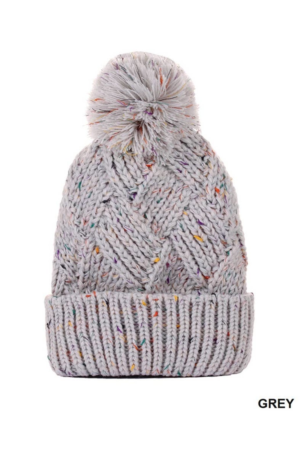 Introducing our Speckled Pom Pom Beanie, perfect for keeping you warm this winter. Made of durable acrylic material, this beanie has a circumference of 18-25 inches. Stay stylish and cozy with our speckled design and add a pop of color with the included pom pom. Upgrade your winter wardrobe today.