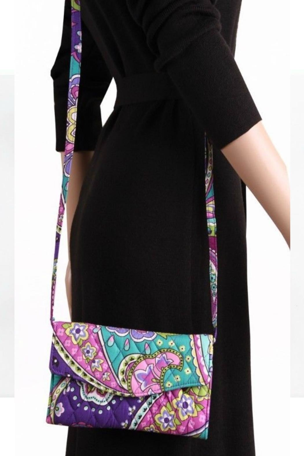 Here is the Vera Bradley Strap Wallet in the Stamped Paisley pattern. Rightly named! It is a wallet that holds everything you need it to, with a crossbody strap to make it hands free! Why didn't they think of this years ago? Magnetic snap under front flap. Back has two zip pockets; one for change and one that can be used for most phones ( up to 5.5"). Inside, there are rings to snap the strap to, three bill slots, twelve card slots, and an ID window. Click on "Mimi's Gift Gallery" to find other Stamped Paisley bags and accessories. Dimensions: 7.5" long x 5" tall x 1" deep with a 54" crossbody/shoulder strap