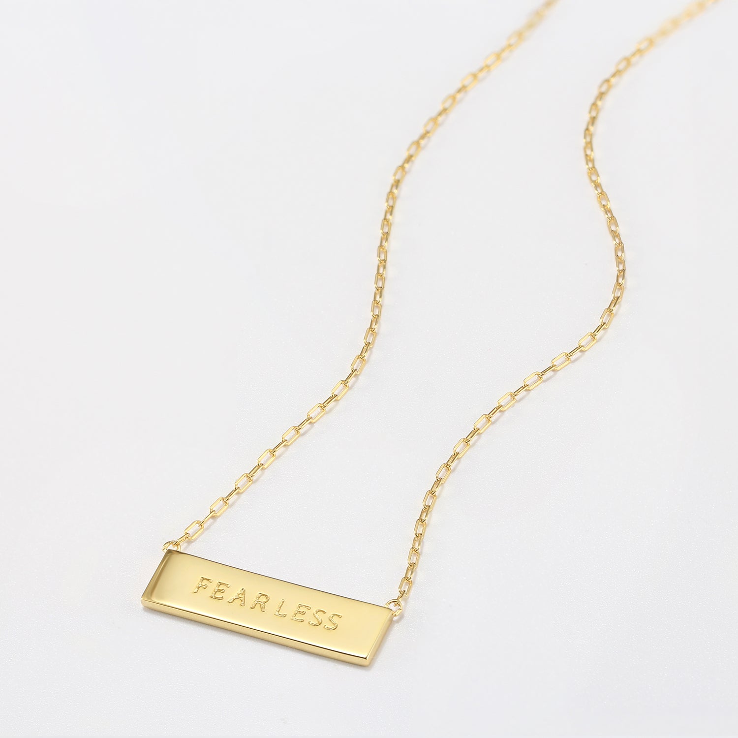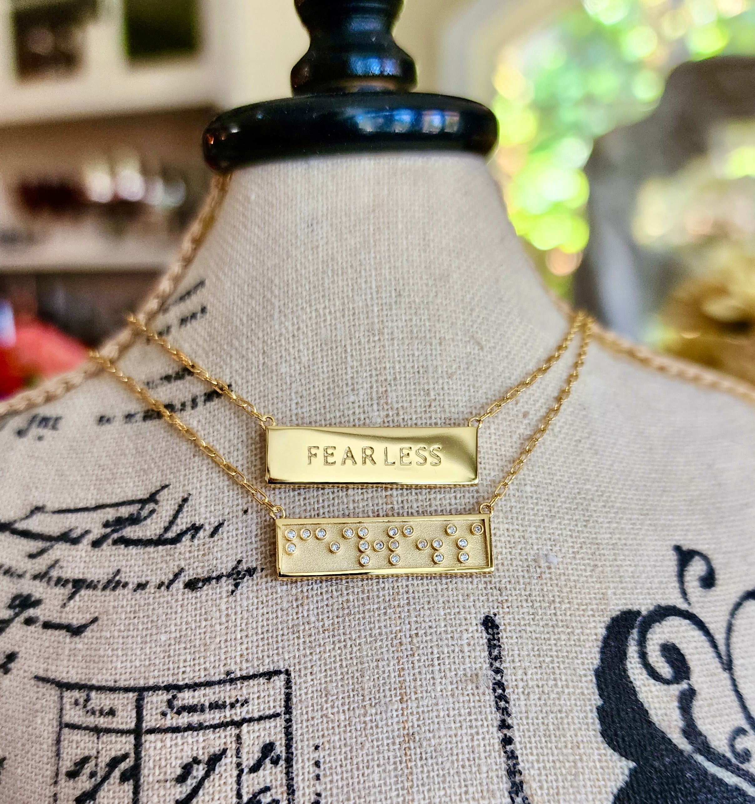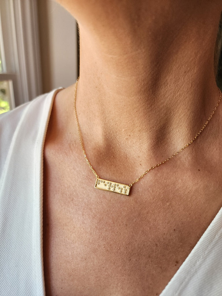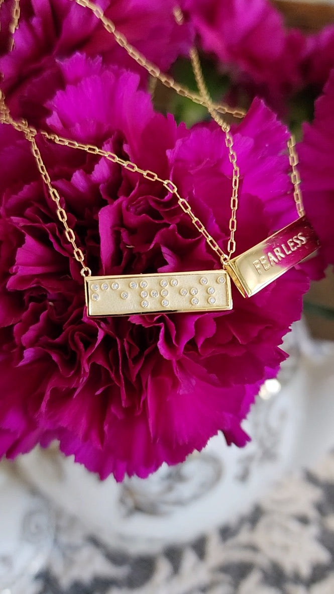 Discover the Touchstone Fearless FINE Braille Mini-Bar Necklace, crafted in solid 14k gold and set with diamonds. This unique piece features a horizontal bar with set stones that spell out FEARLESS in Braille. You can 'read' the sentiment through touch, with the translation simply and elegantly engraved on the backside. This makes this piece reversible to reflect your style mood of the day.
