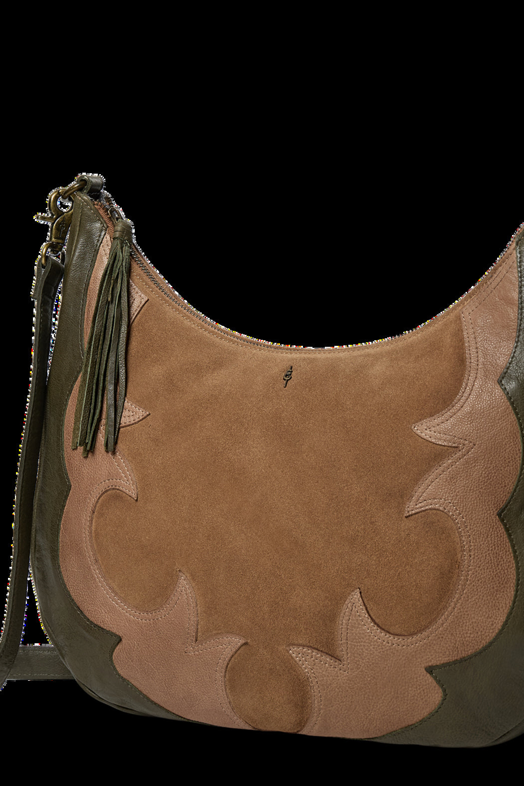 The Day & Mood DayFrey Hobo is a stylish and casual hobo-style handbag. It features a soft, slouchy silhouette with a mix of suede and leather materials, decorative stitching, and an adjustable strap for versatile carrying options. The tassel detail adds a touch of bohemian charm.