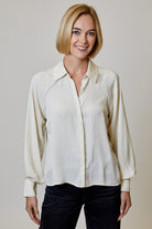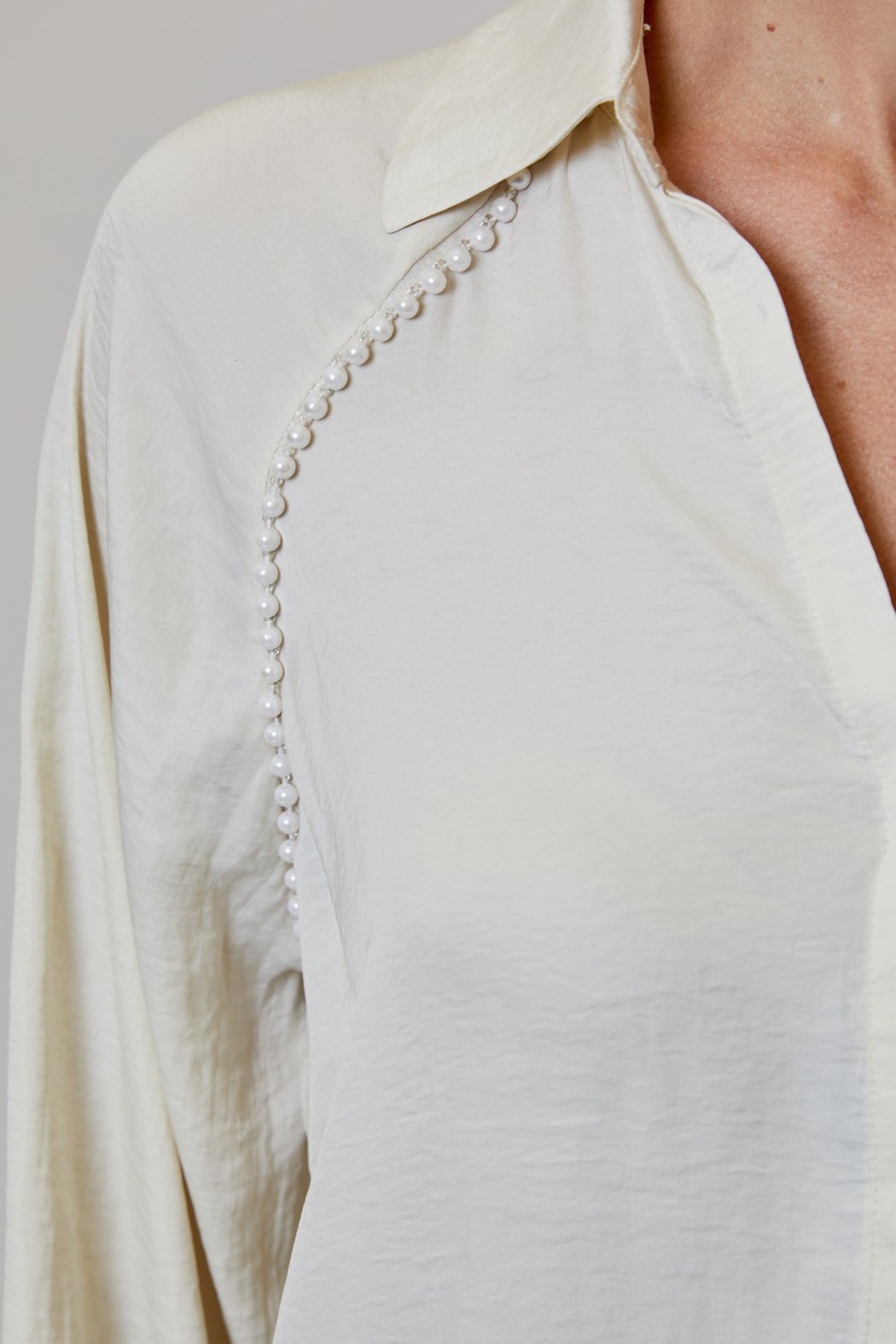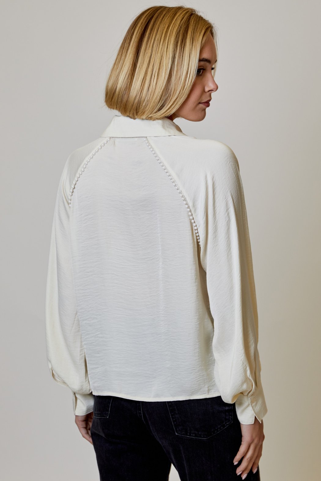A refined pearl-embellished button-front blouse with a classic shirt collar and soft long sleeves. The Lois Pearl Embellished Blouse is cut from a lightweight, silky fabric that drapes effortlessly for polished layering. Design History brings delicate pearl trim along the raglan seams for subtle texture and elevated detail. Wear it tucked into tailored trousers for work or styled with dark denim for evening events. 95% Polyester, 5% Spandex