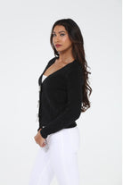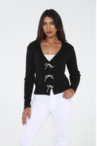 The Mira Cardigan: This charming cardigan features a bow embellishment, a V-neck design, and a beautiful knit pattern, perfect for adding elegance to your outfit. 100% Acrylic
