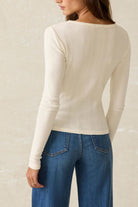 Detail: Long sleeve. Scoop neck with pique rib trim detail.