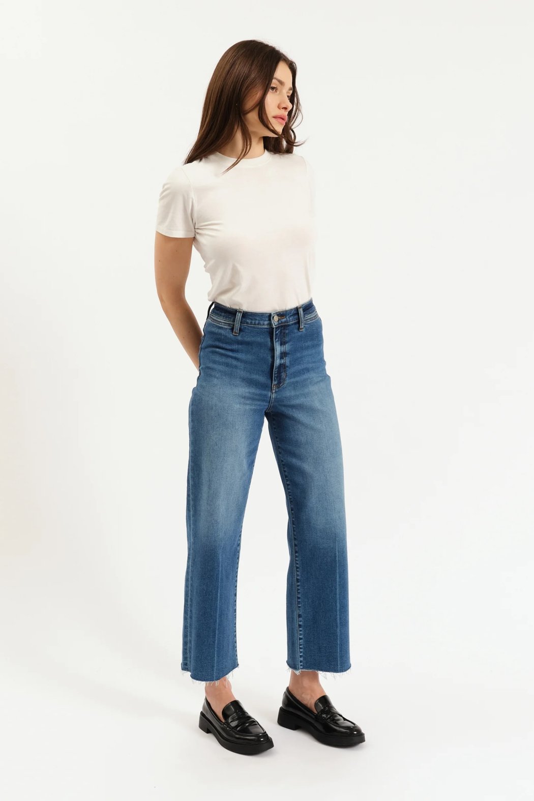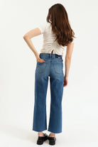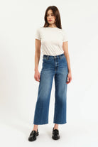 The Pleaser in Indigo Wave is our tried and true high rise wide ankle in a dark blue indigo with soft fading. Constructed from our Hug fabric, this jean is flexible enough to hug your body, yet heavy enough to cinch you in.