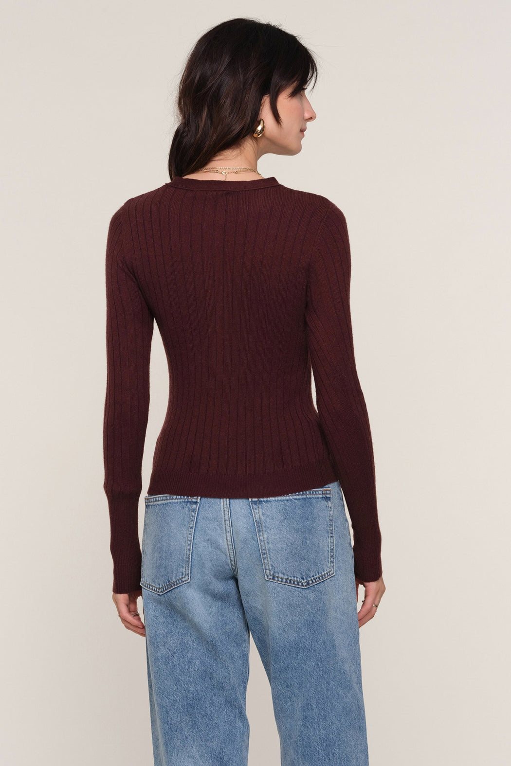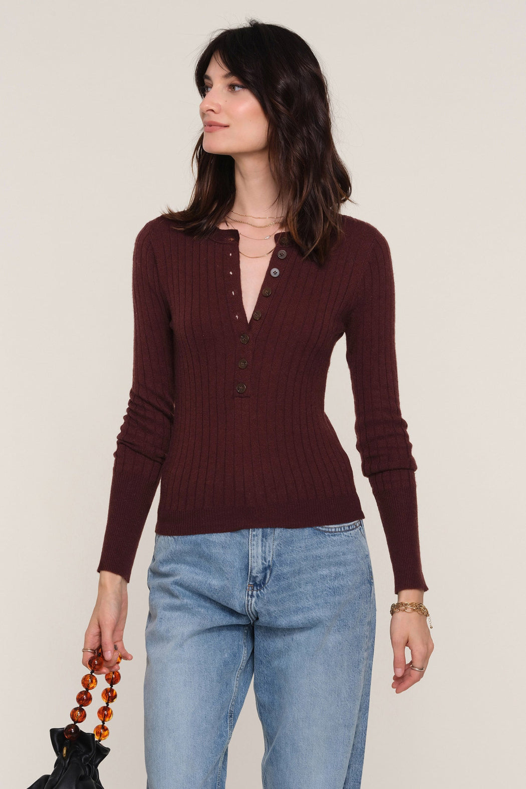 The Stacy Top is a Heartloom essential. It is a slim-fit henley, made from a cashmere blend. It has a rib throughout the body making it fit to perfection.