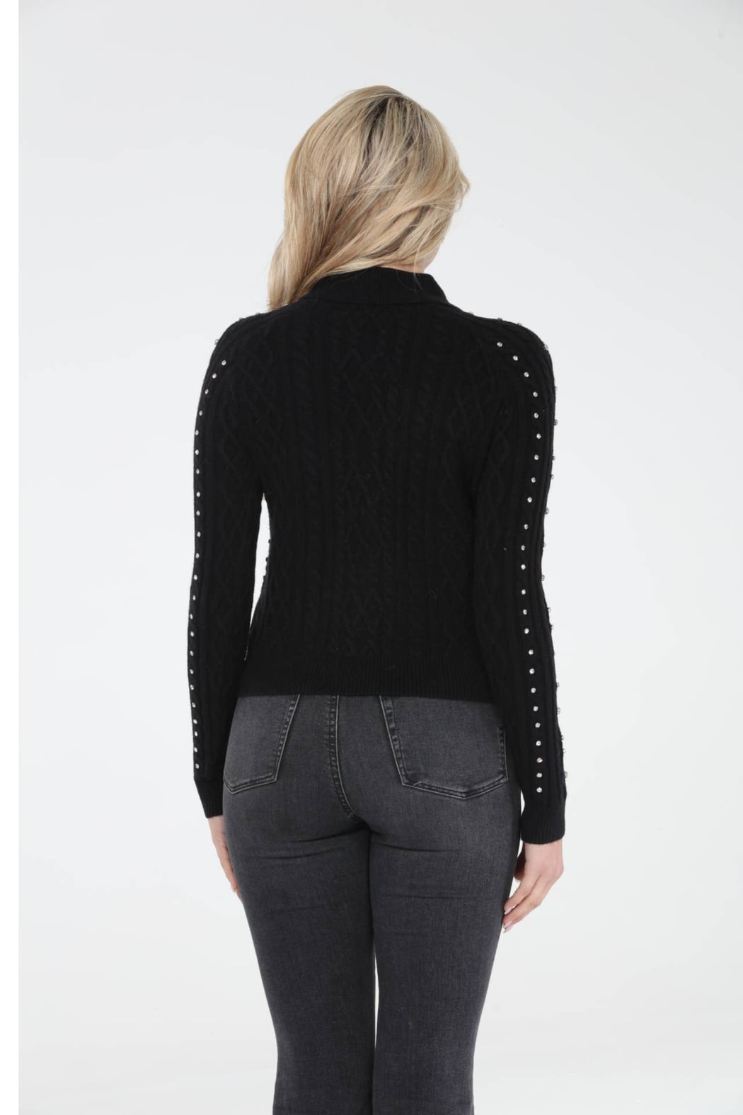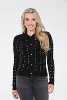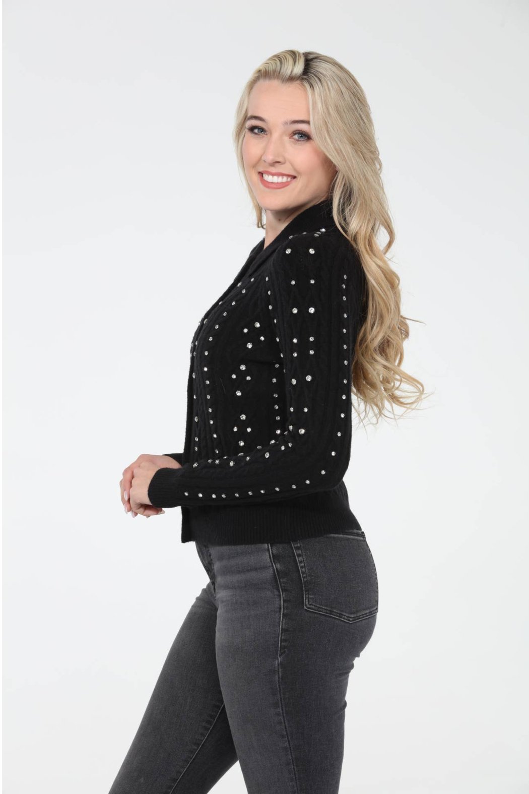 The Estelle Cardigan: This stunning cardigan features an overall rhinestone diamond design and a collar neckline, adding elegance and sparkle to your outfit.