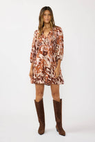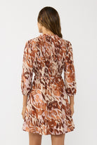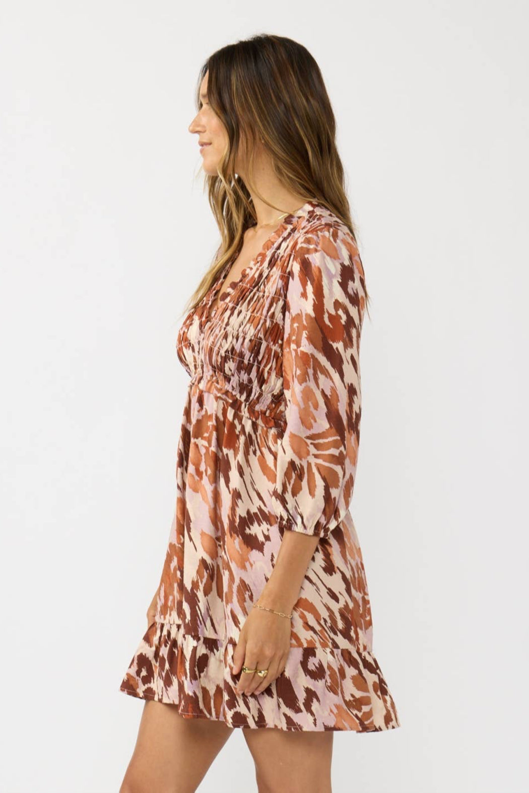 Designed in lightweight rayon crinkle gauze, this fall-ready mini dress features a smocked front and back bodice with evenly spaced stitching for a flattering, textured look. The deep V-neckline is trimmed with a single-layer ruffle edge, while the waistline is gently gathered with elastic for shape, and the long sleeves and hem are finished with soft ruffle detailing for a playful finish.