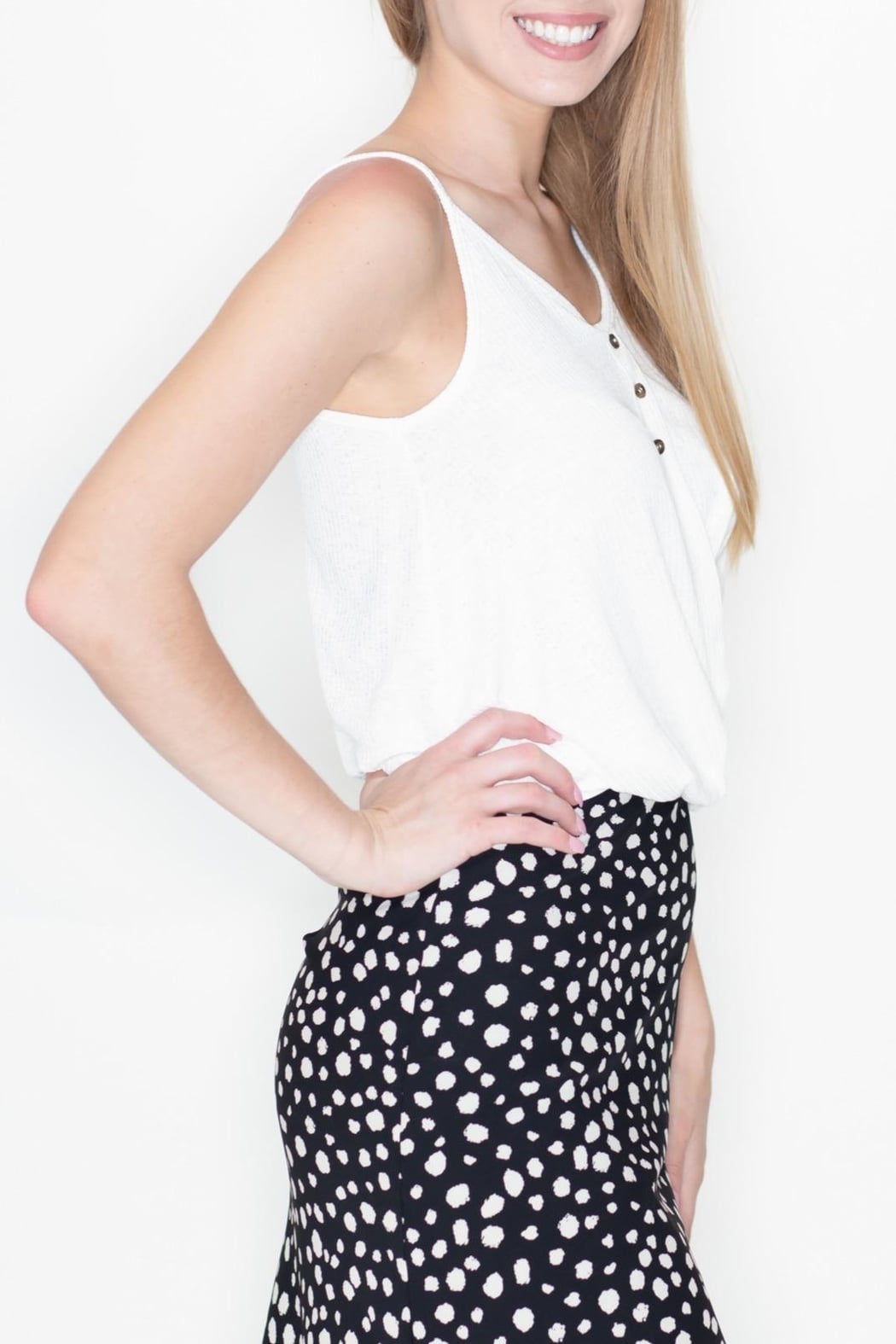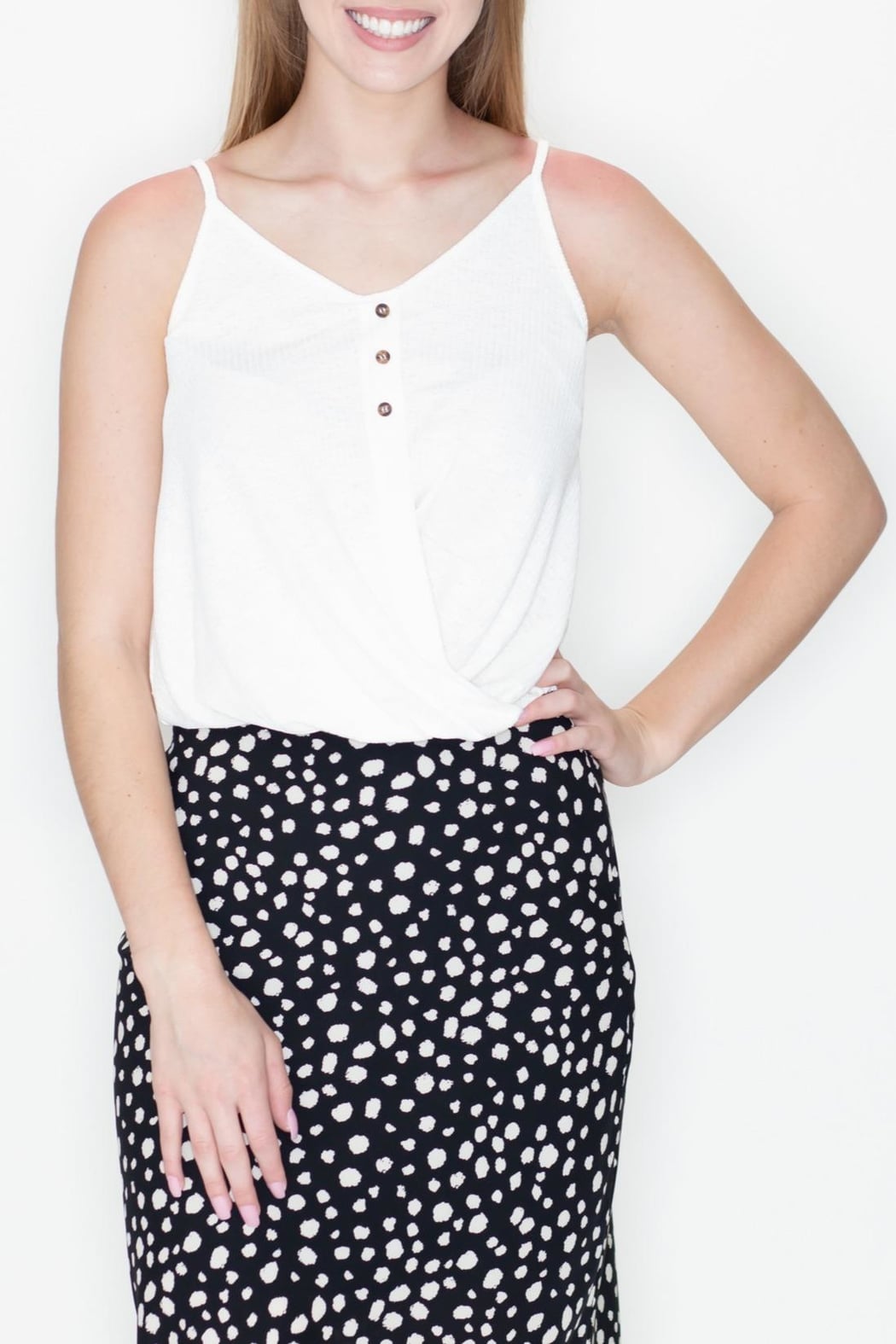 Button down, ribbed knit cami top with front twist detail.