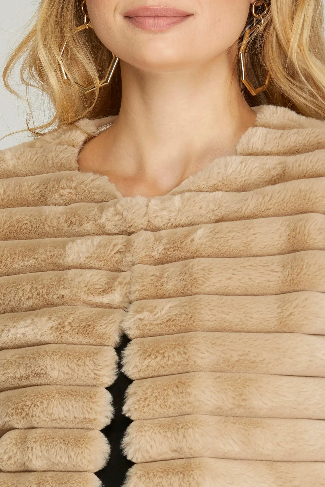 The Half Sleeve Faux Fur Crop Jacket is a plush, short-length jacket with soft, horizontal ribbed faux fur. She + Sky designed this crop jacket with half sleeves and an open-front silhouette ideal for layering over evening or casual looks.