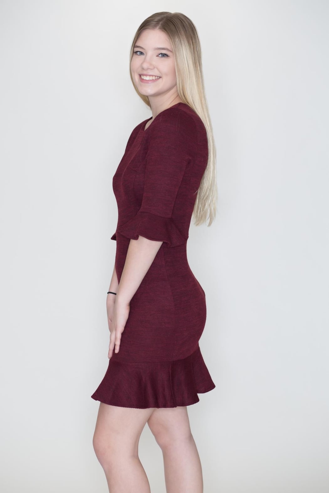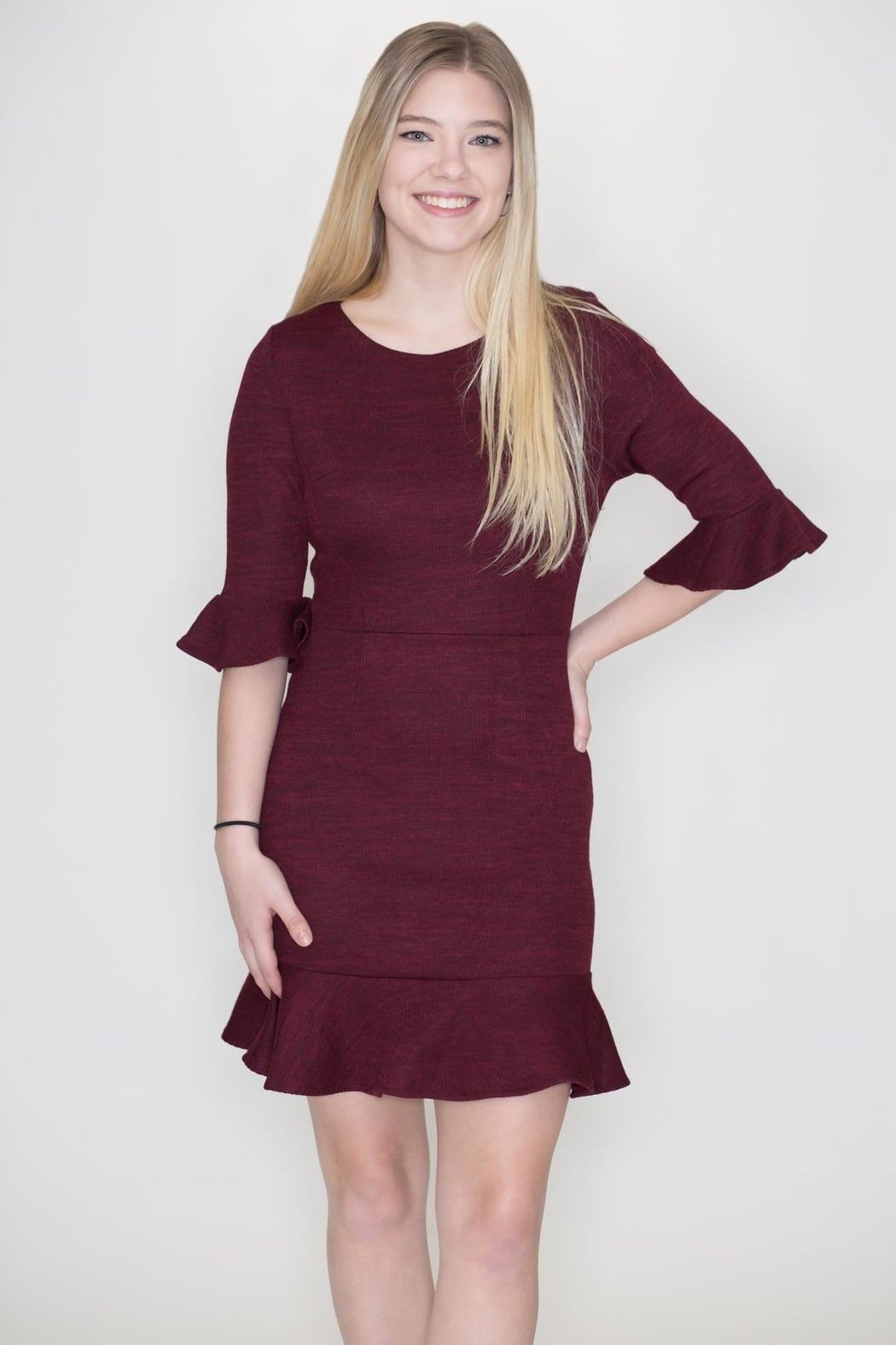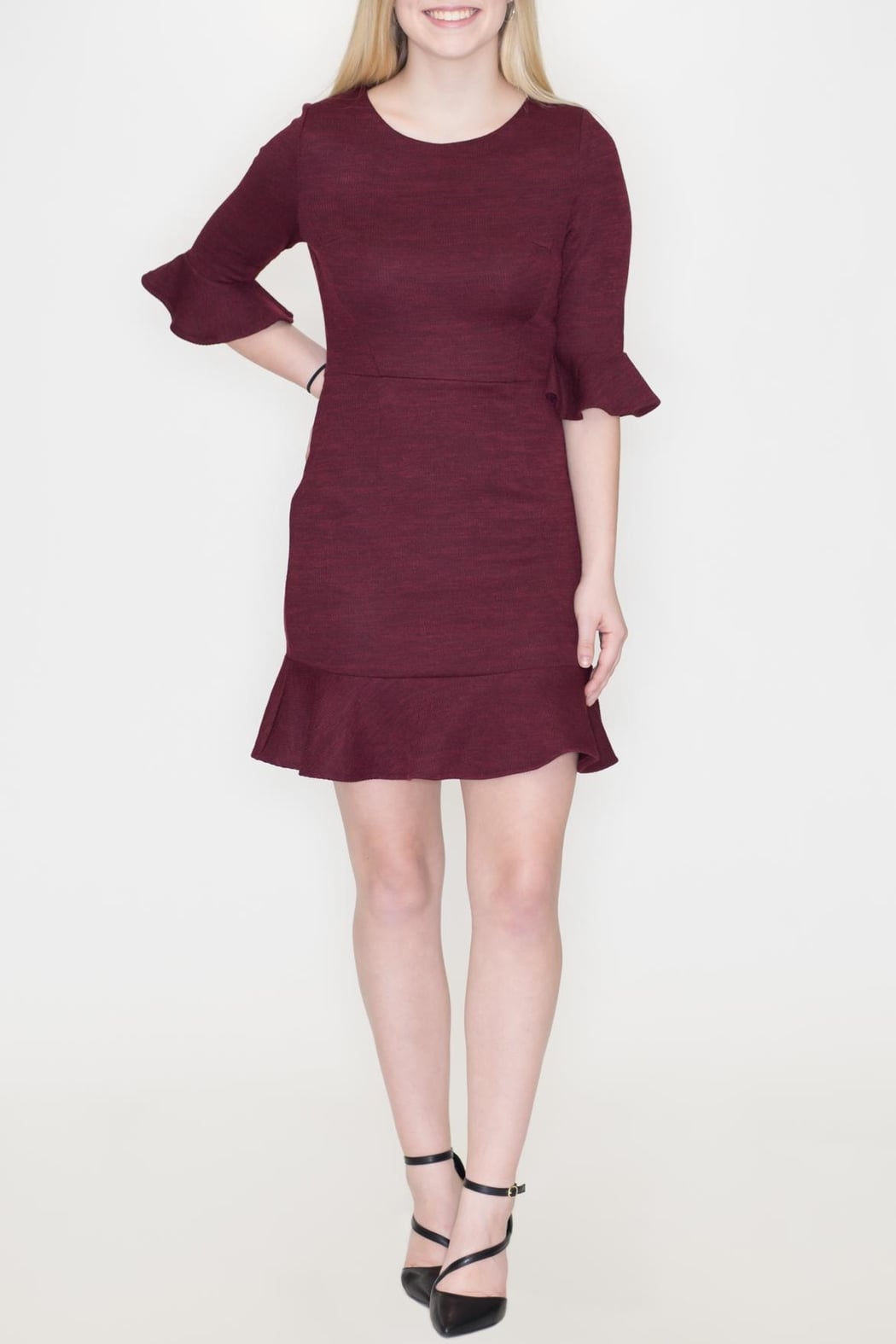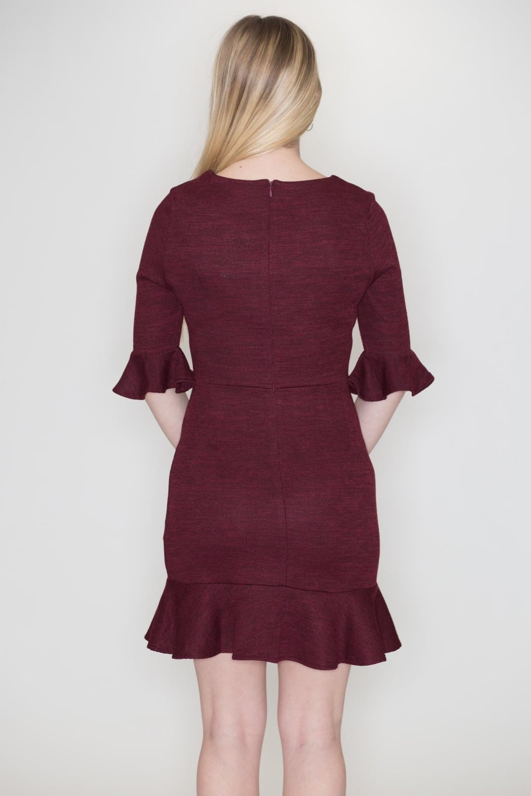 Wine knit dress with ruffle three quarter sleeves and bottom hem accents and back zipper closure.
