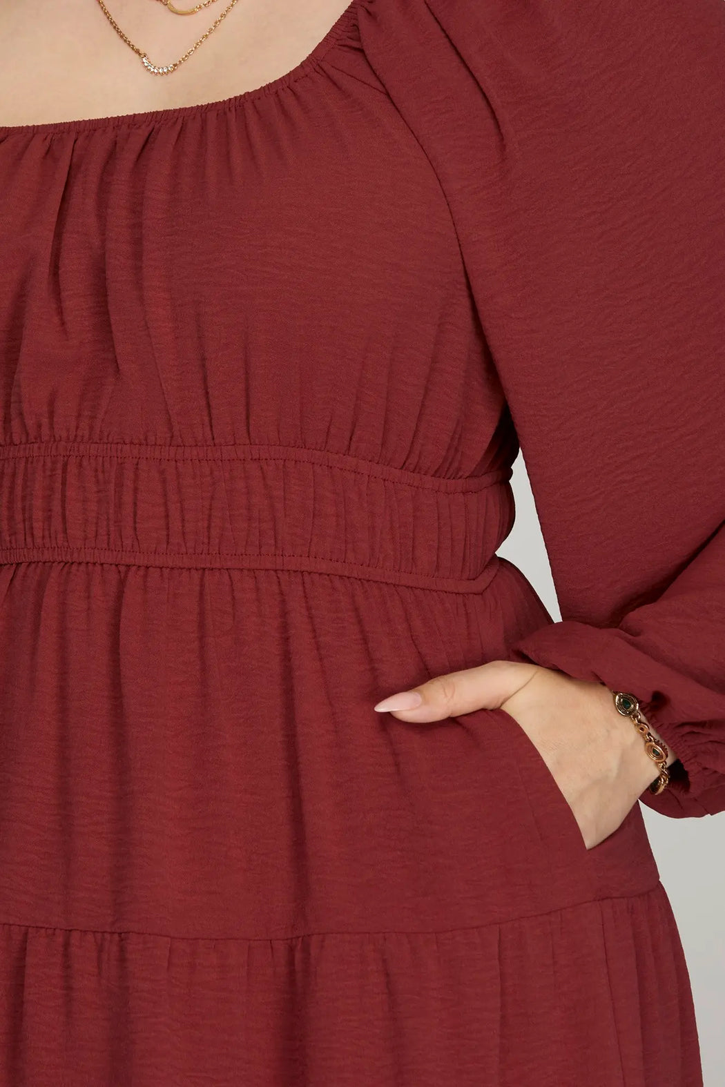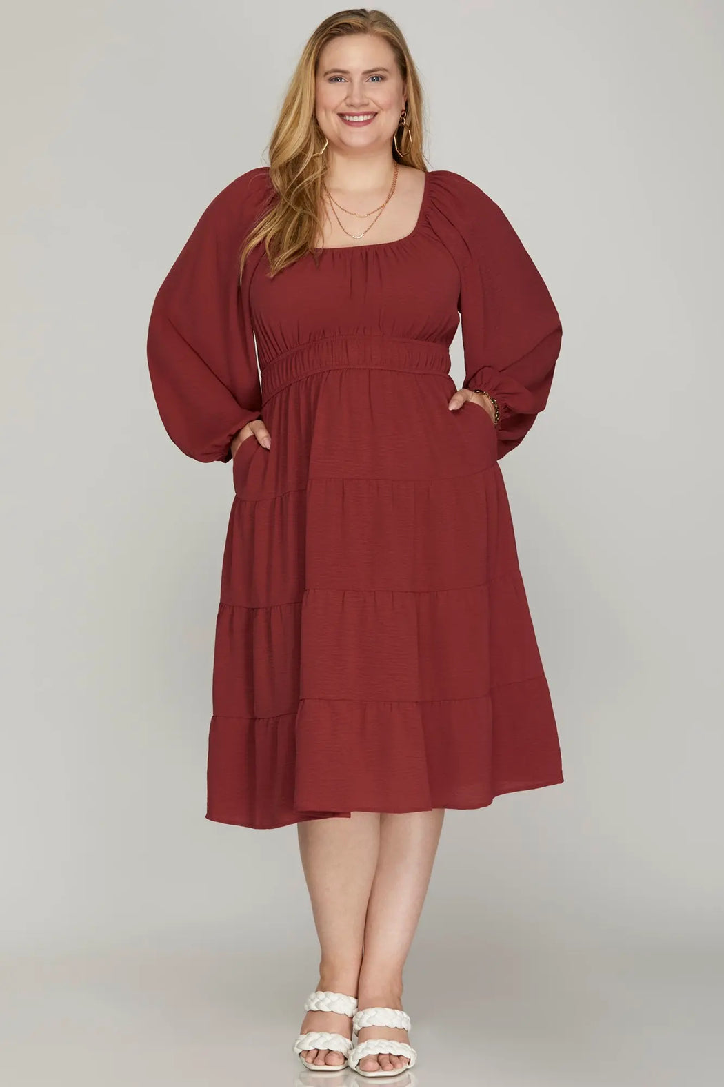 A relaxed tiered silhouette with a defined elastic waist and long sleeves gives effortless polish to everyday dressing. The Long Sleeve Tiered Dress from She + Sky is made from a textured woven fabric with soft gathers and roomy tiers for movement. Wear it with ankle boots or sandals for casual outings or layered under a coat when temperatures dip. This dress even has POCKETS!