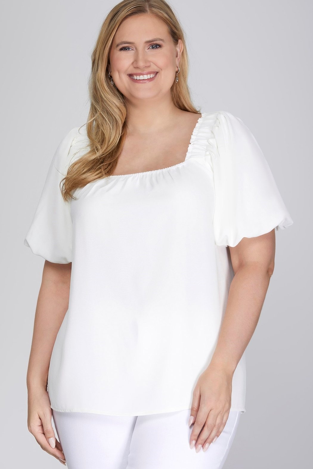 This puff sleeve square neck woven top is the perfect basic top to have in your closet. It has elastic on the sleeves so they can be worn up on the shoulder to make that square neck or for something different you could wear them off the shoulder also. The model is 5'8.5" and is wearing a size XL.