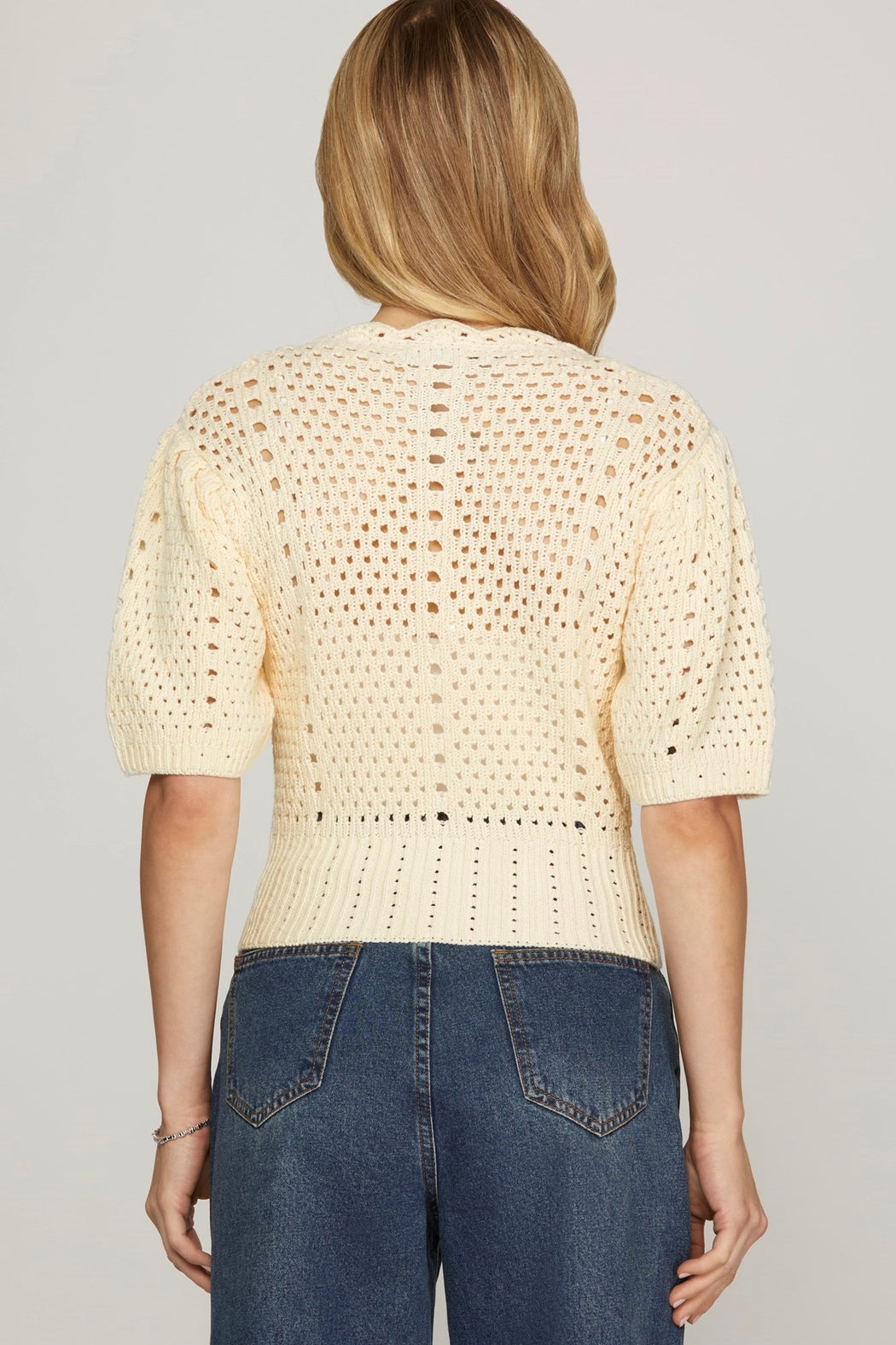 This is a fun short sleeve scallop sweater cardigan. You can easily pair this with any top or dress. It can be dressed up or dressed down. You can also wear it buttoned up or unbuttoned for different looks.