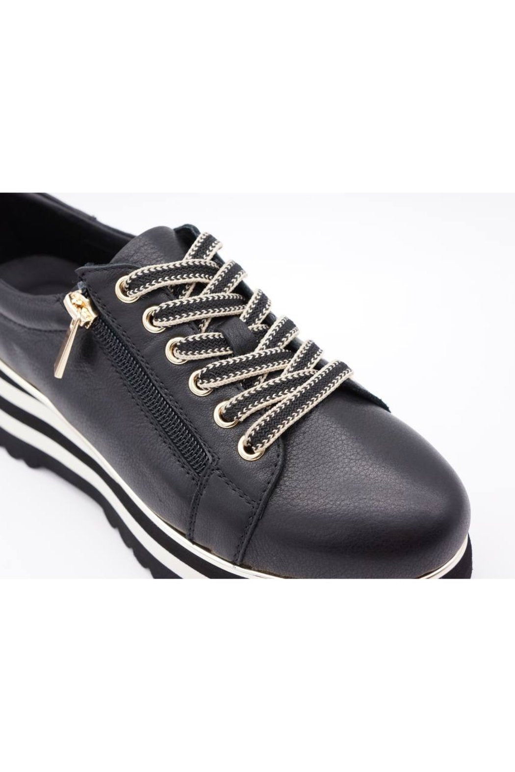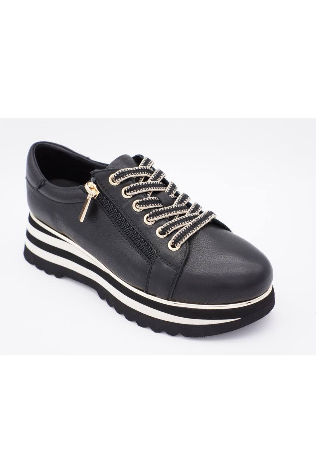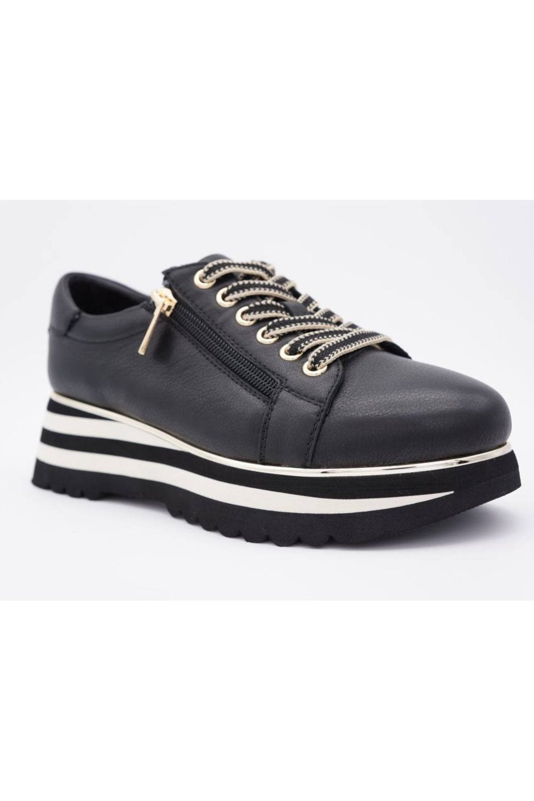A functional side zipper with a gold metallic pull tab adds both convenience and a touch of urban flair, allowing for easy on-and-off wear. The sneaker sits atop a thick striped platform sole in black and white, with a gold accent strip that wraps around the base, delivering standout style and added height without sacrificing comfort.