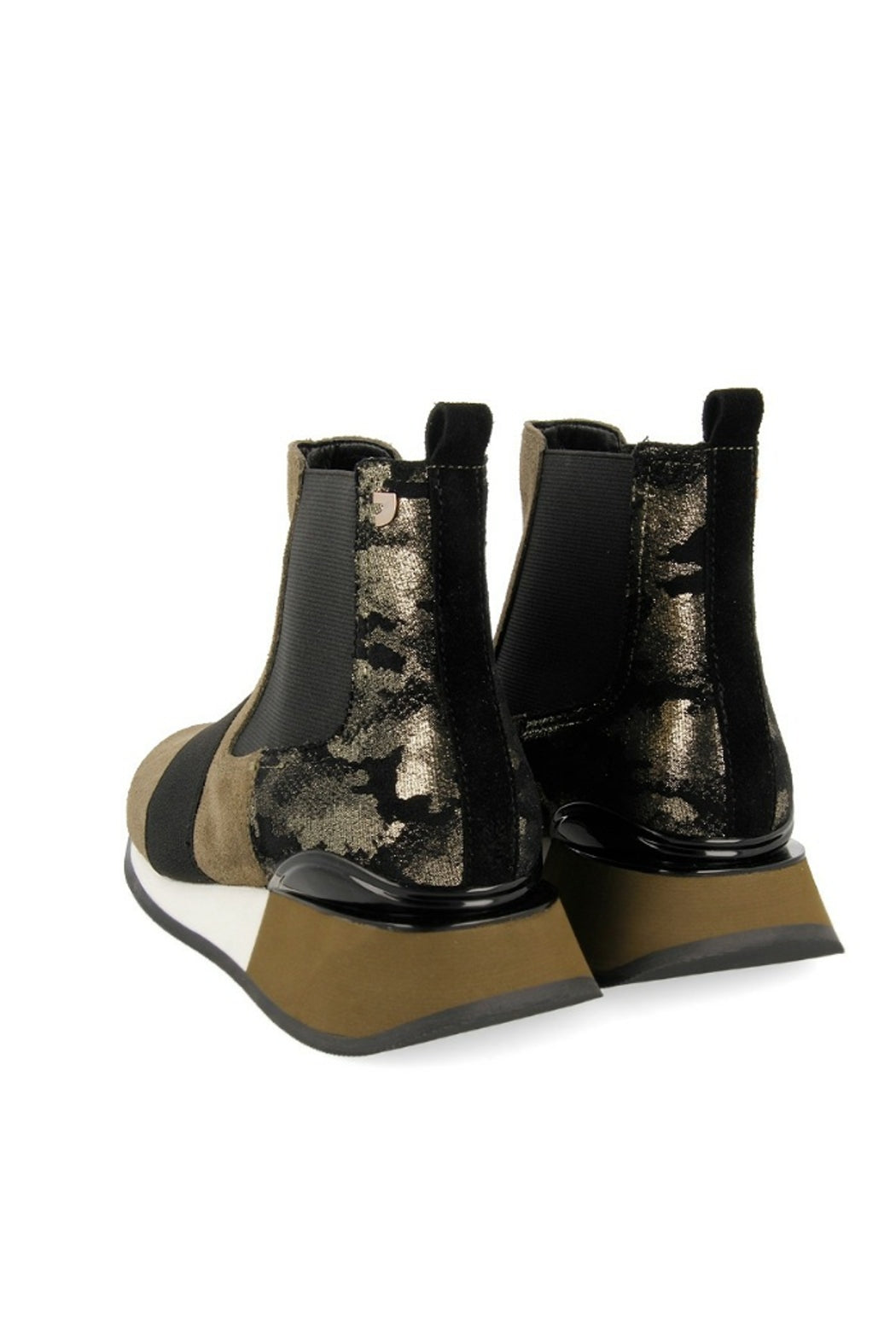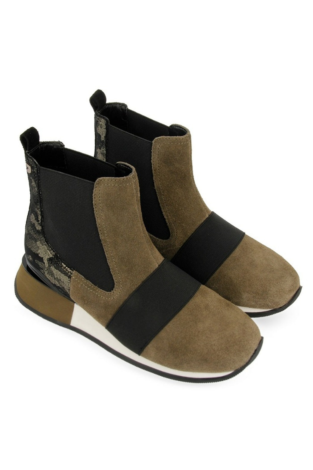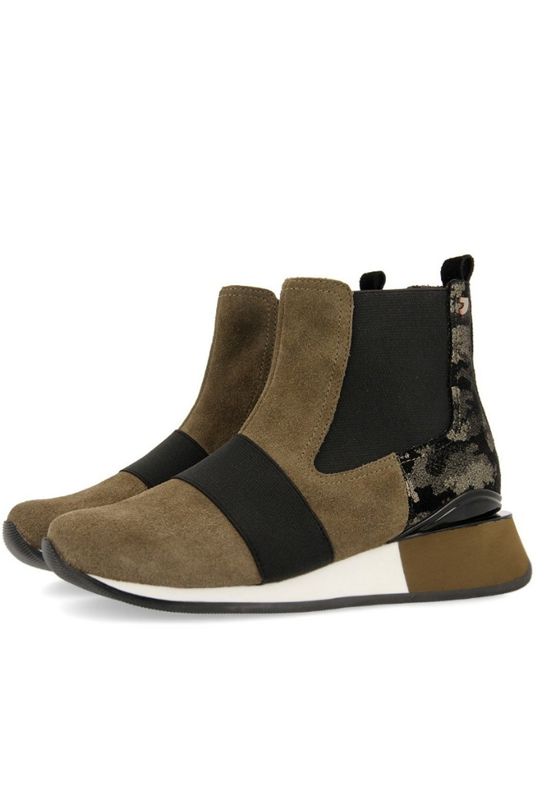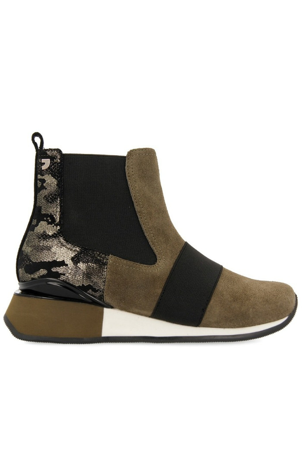 One of our musts with the season's colors. High top sneakers in chelsea style made in khaki green split leather detailed with camo print. Breathable lining, padded insole and two-toned wedge rubber sole. You absolute essentials for this fall winter season are at Gioseppo's new woman collection.