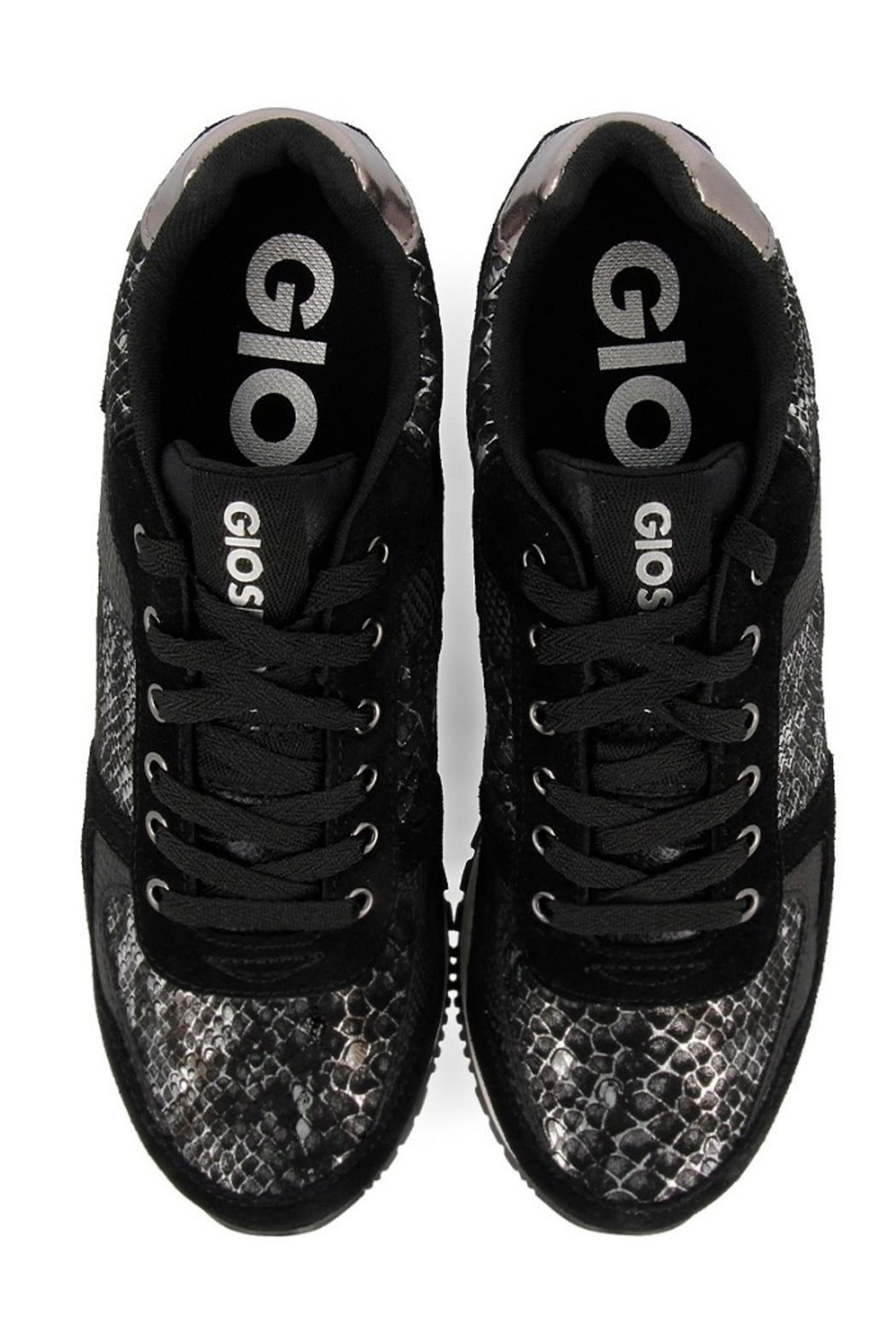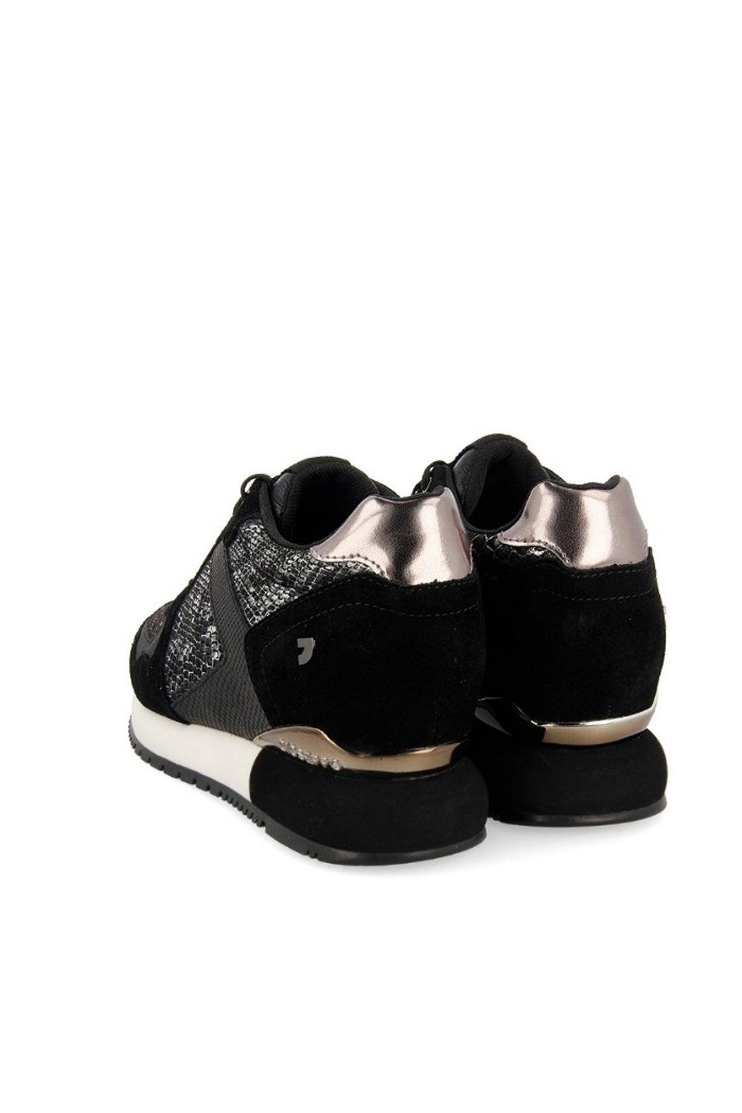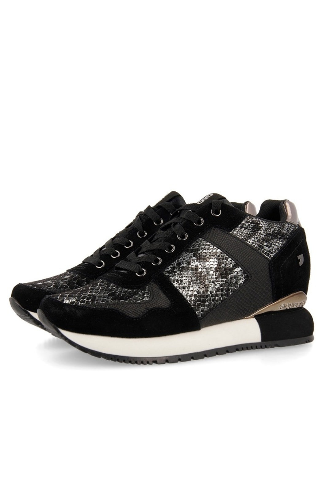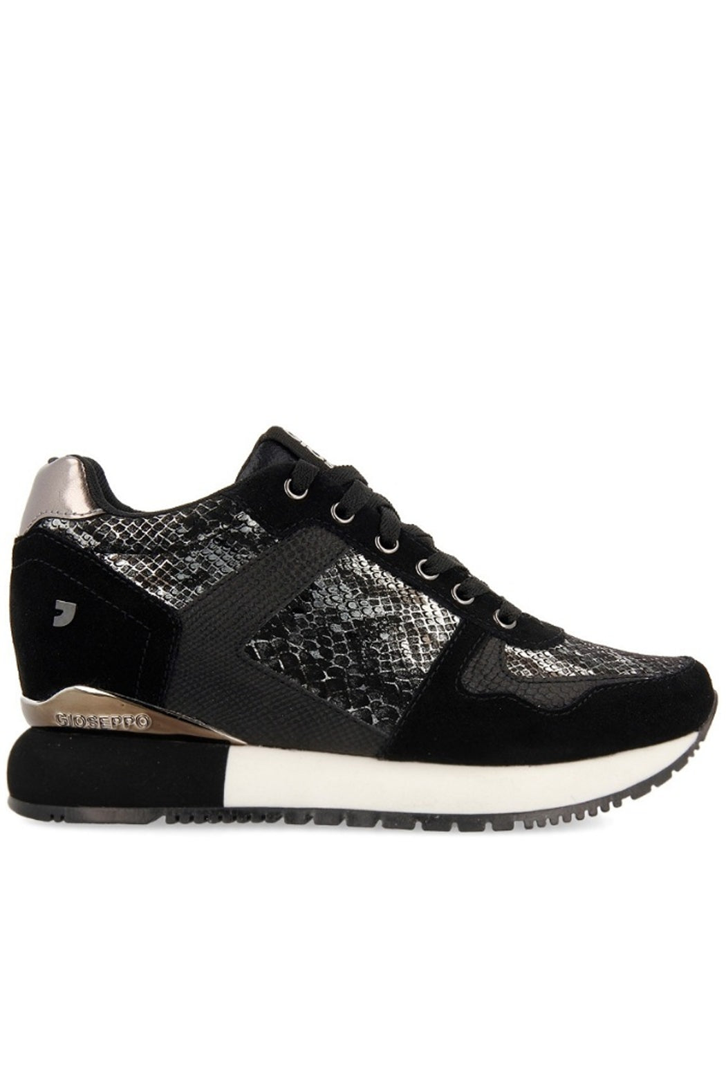 Maximum trend and comfort with added cm. Monochrome sneakers in black split leather wit metallic snake skin details. Internal wedge of 3 cm+2,8 cm sole. Breathable insole and padded sole. Rubber sole. Discover all the new models of Gioseppo Woman new collection.