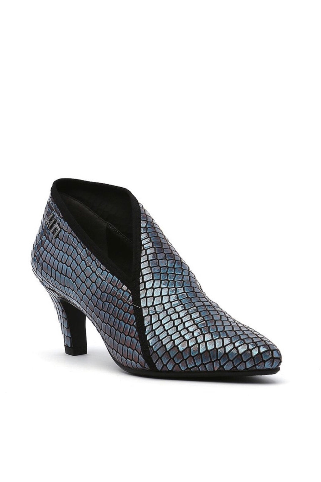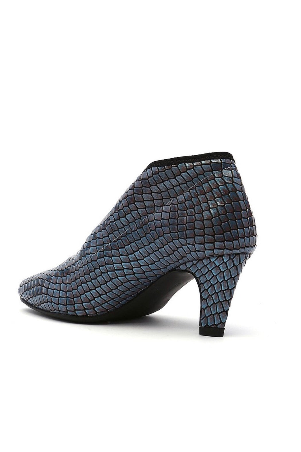 The Fold Lite Mid is a mid heel ankle bootie with a soft almond toe and asymmetrical topline.