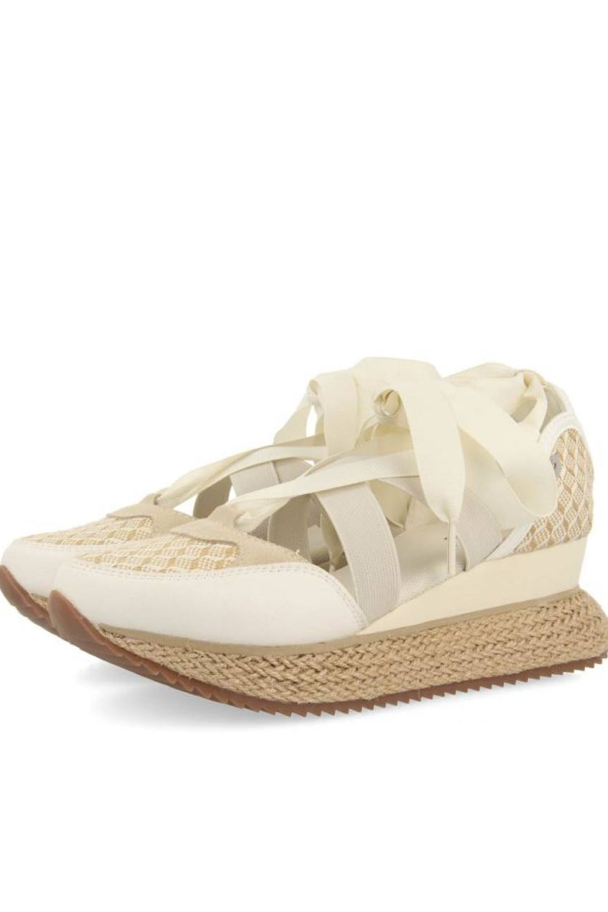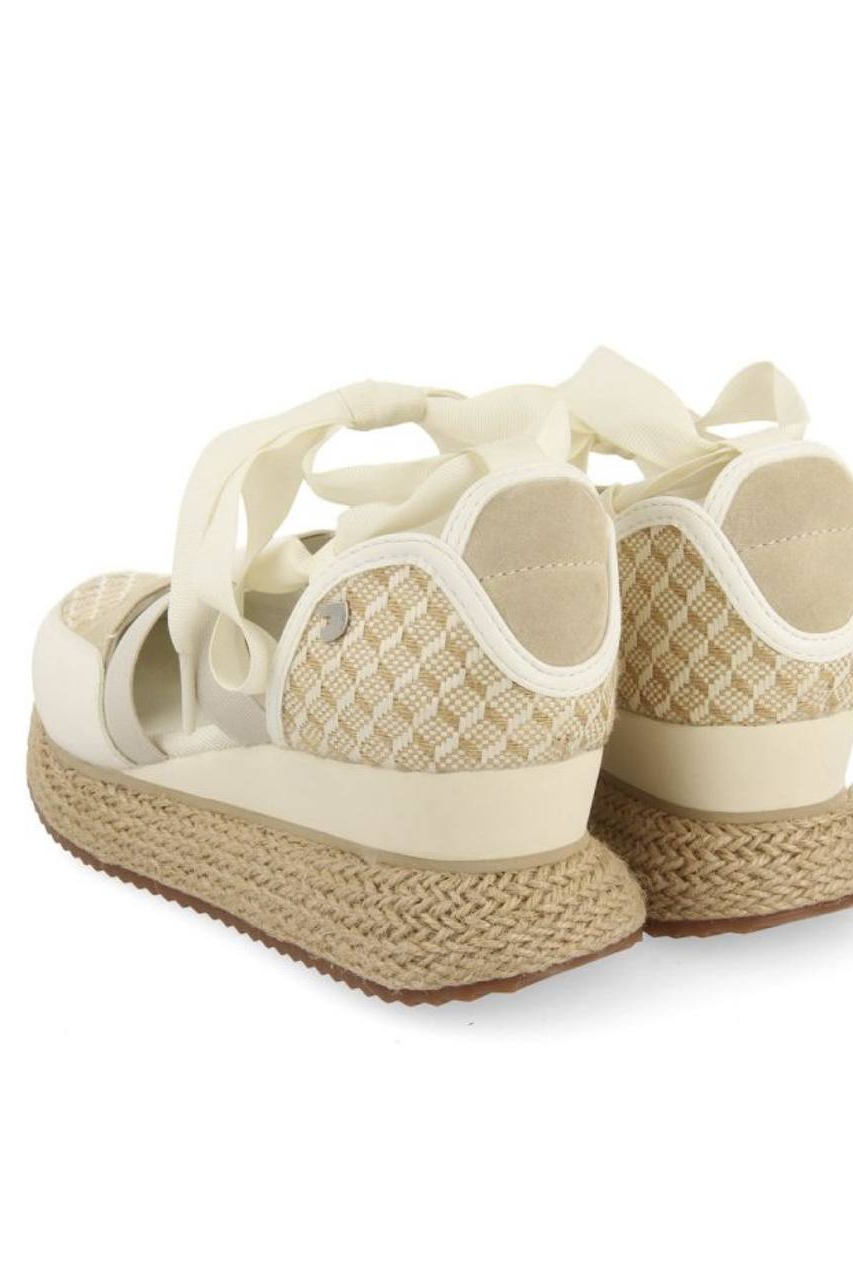 Off-white wedge sandals with tied straps. Design with geometric white and cream fabric. The sole combines a raffia and EVA lining. Cushioned insole. Heel height 6 cm.