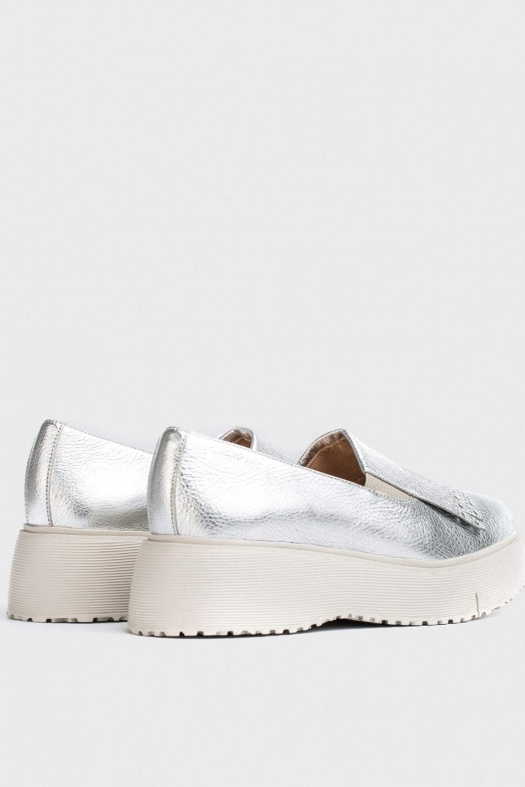Silver metallic leather Penny loafer-inspired moccasin with fringe detail, side elastic for a more comfortable fit and wide sole. Wonders quality and comfort.
