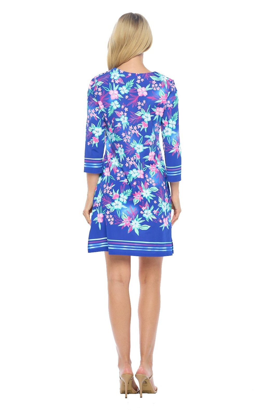Quarter Sleeve Shift Dress. Soft and Stretchy Fabric. Model In Size Small