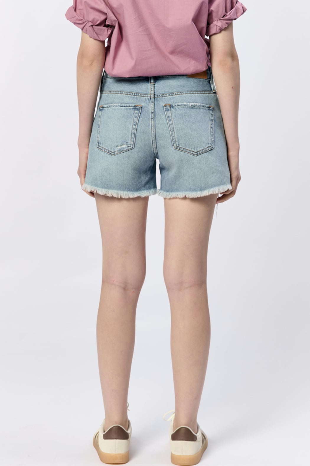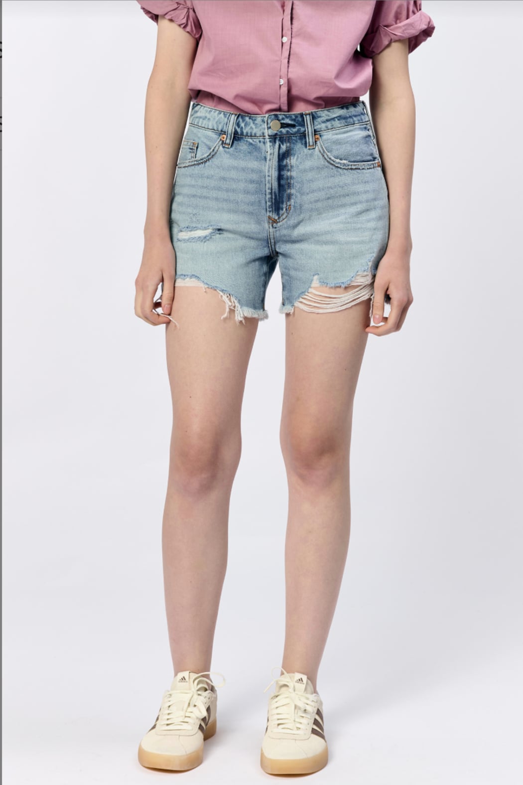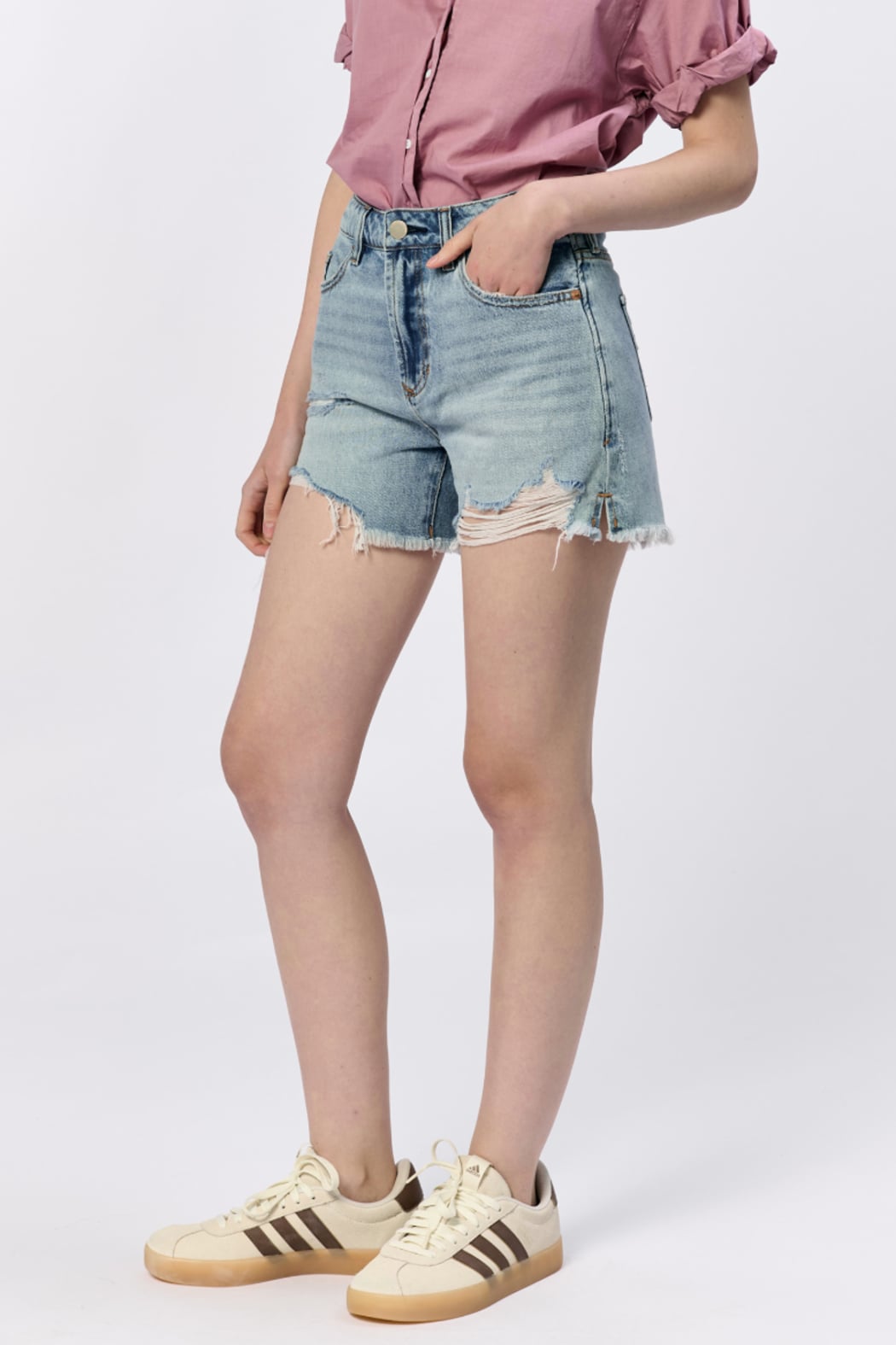 Shorts inseam on comfort stretch denim accented with random destructions & tears, hand sanding hip whiskers, pocket & waistband grindings, cut off hem & destructions & side vent.
