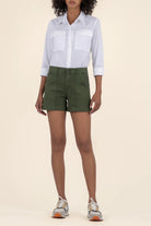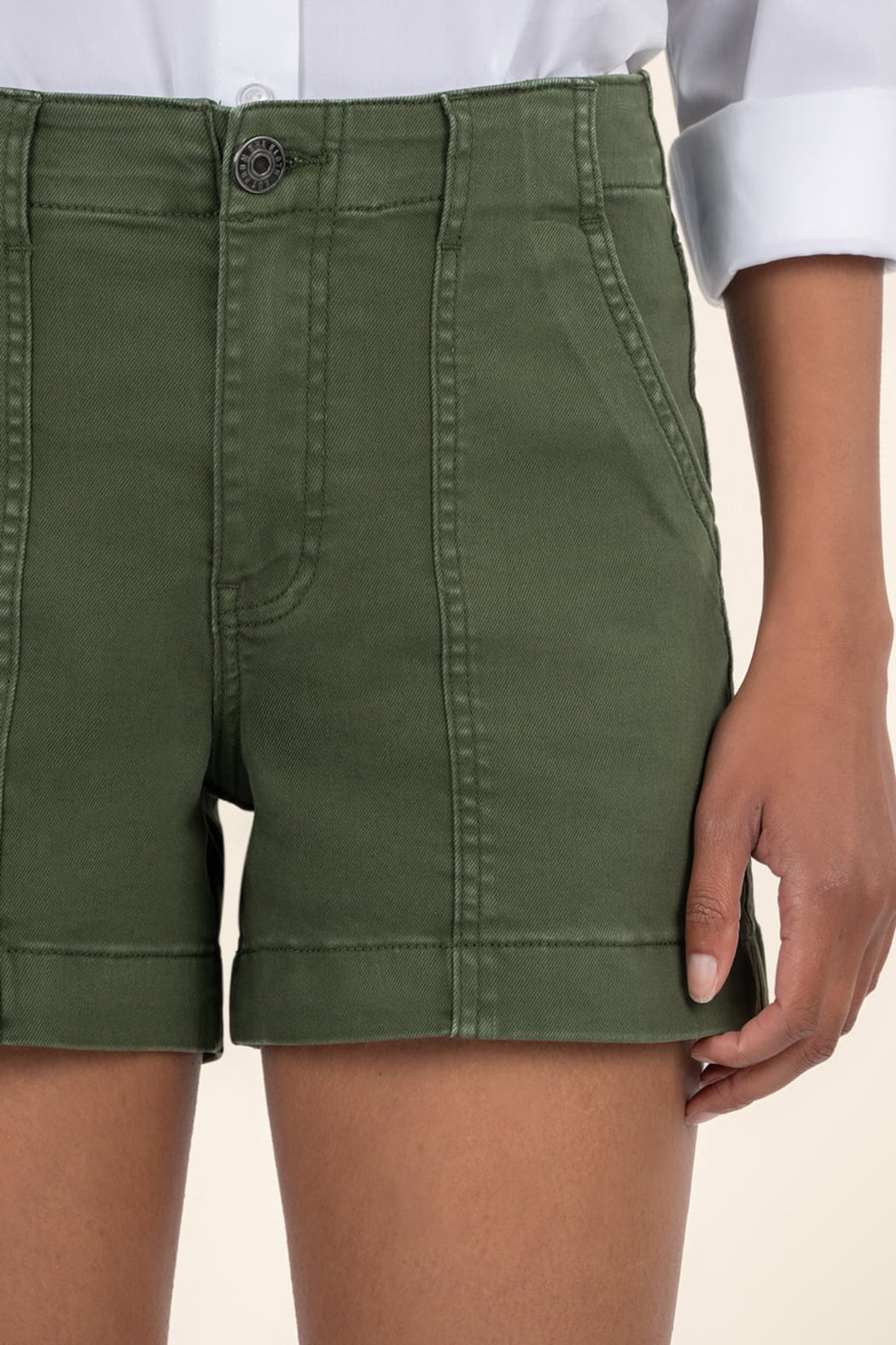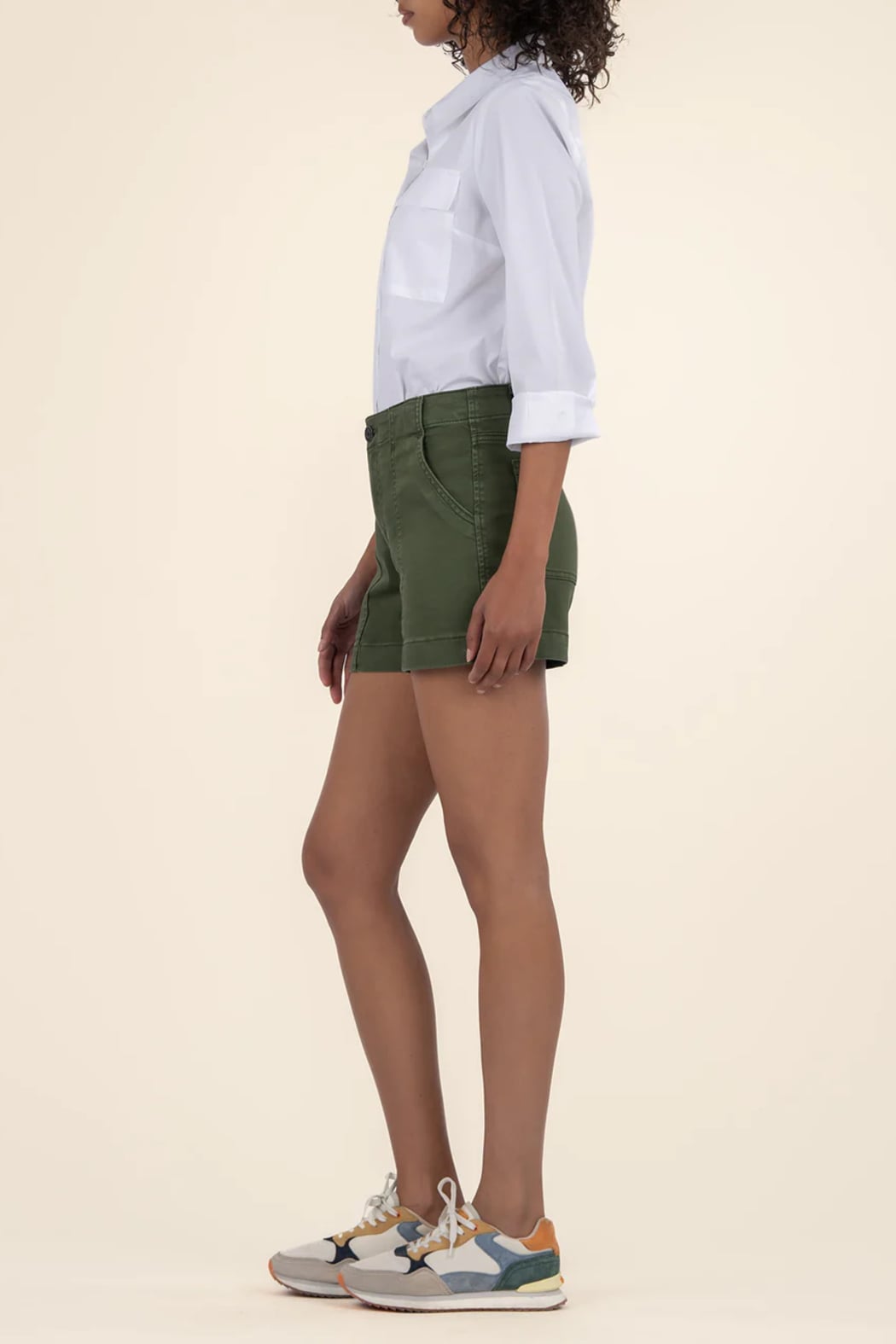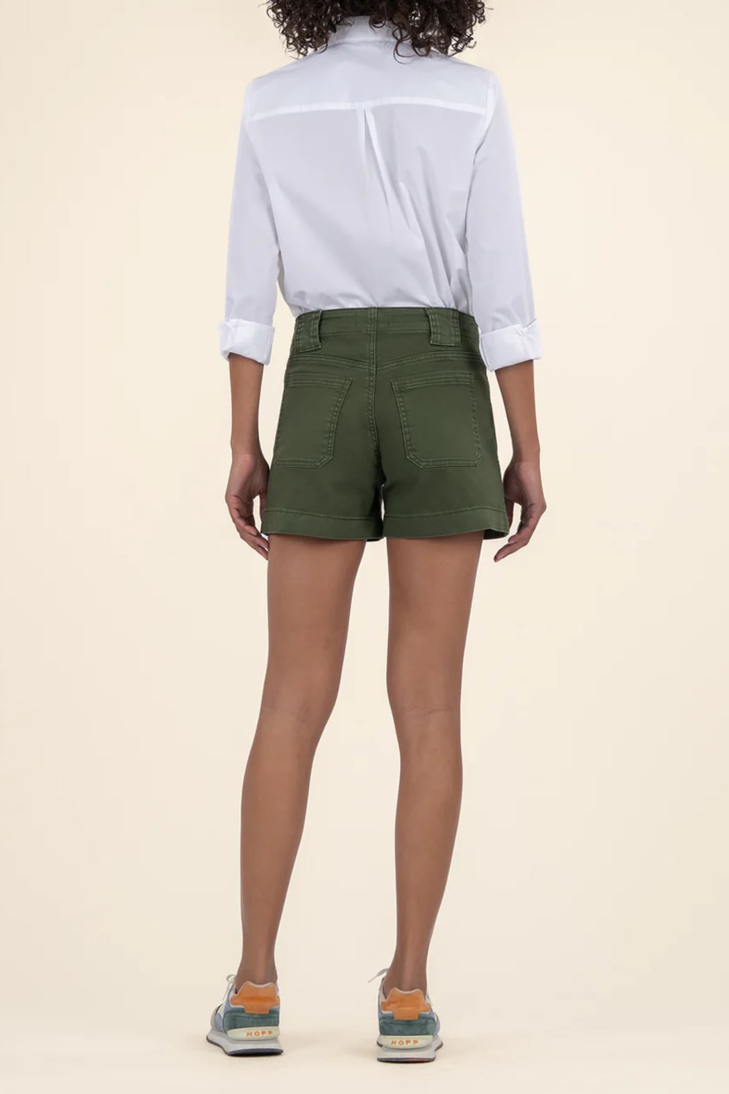 These high rise Shorts offer a flattering fit with a unique seam for added structure and a sleek, tailored look. With wide belt loops for versatility and deep pockets for functionality, they blend style and practicality effortlessly. Perfect for any occasion, these shorts are a wardrobe essential. Fabric: 91% Cotton, 7% Polyester, 2 Spandex Size & Fit: Inseam: 4 1/4", Leg Opening: 25 1/2", Rise: 10 3/4" Color: OLIVE Model Info: Model is 5'10" and wearing a size 0; Waist 24", Hips 34" Styled with: Analeah Classic Cotton Shirt (KT133801) Size & Fit Inseam: 4 1/4", Leg Opening: 25 1/2", Rise: 10 3/4" Care Machine wash cold inside out with like colors Only non-chlorine bleach if needed Tumble dry low or for better care, lay flat to dry Warm iron if needed Wash once before wearing Fabric 91% Cotton, 7% Polyester, 2 Spandex SKU: KB63401-OLIVE Reviews(Tab Expanded) Questions
