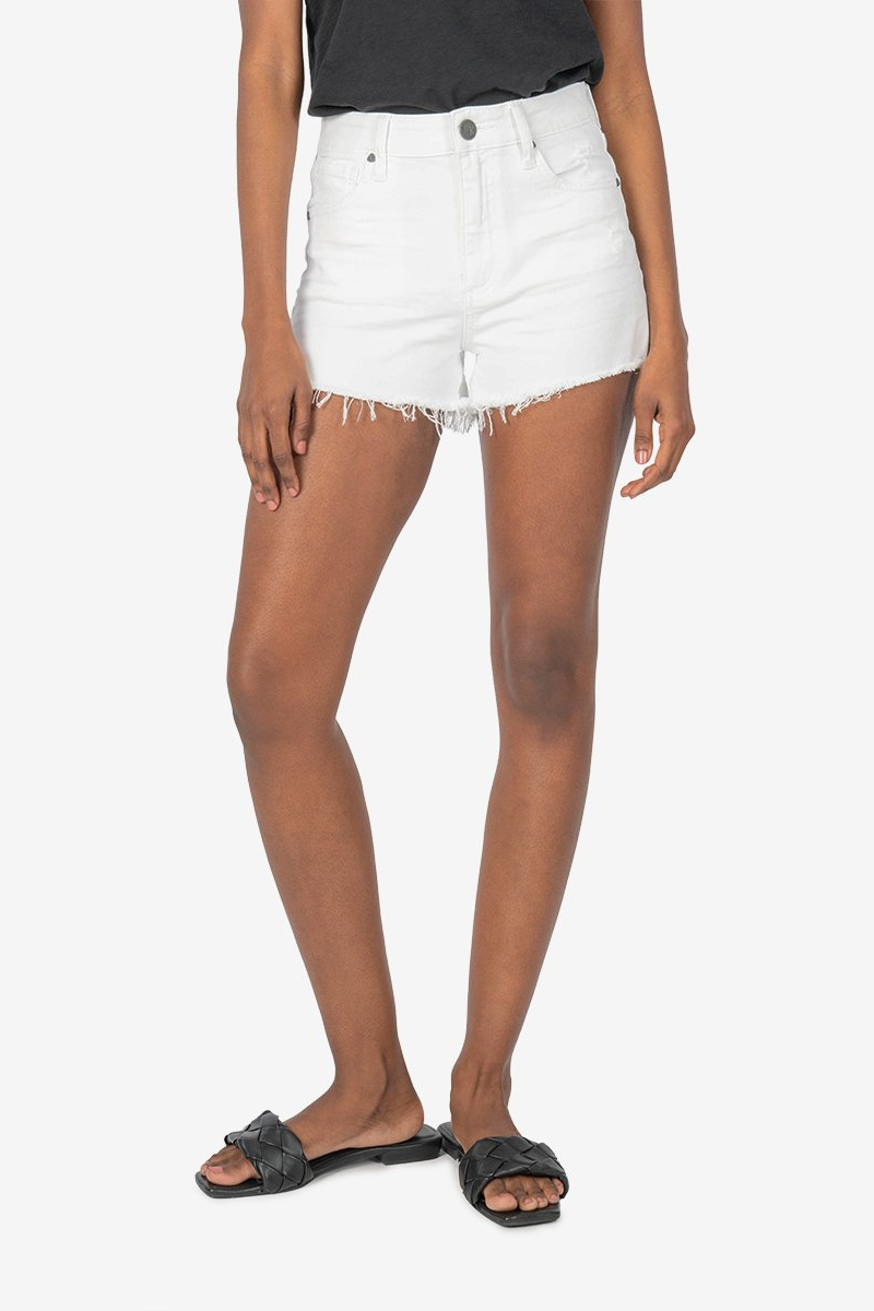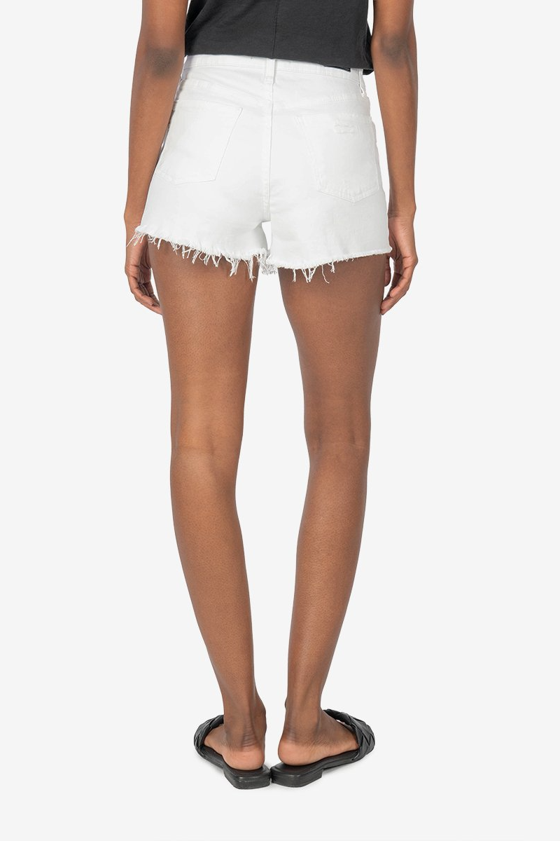 A vintage look without compromising comfort. This high rise denim short with a frayed hem is perfect for those warm summer days. Subtle fraying completes the look.