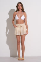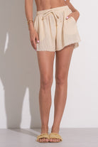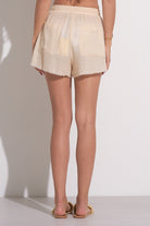 Unleash your playful side in our Lina Shorts. These flowy shorts come with a raw hem and side pockets, perfect for beach days or resort lounging. The elastic waist with tie adds a touch of comfort and style. Ideal for relaxing times, pair it with our Lina top for the perfect summer look!