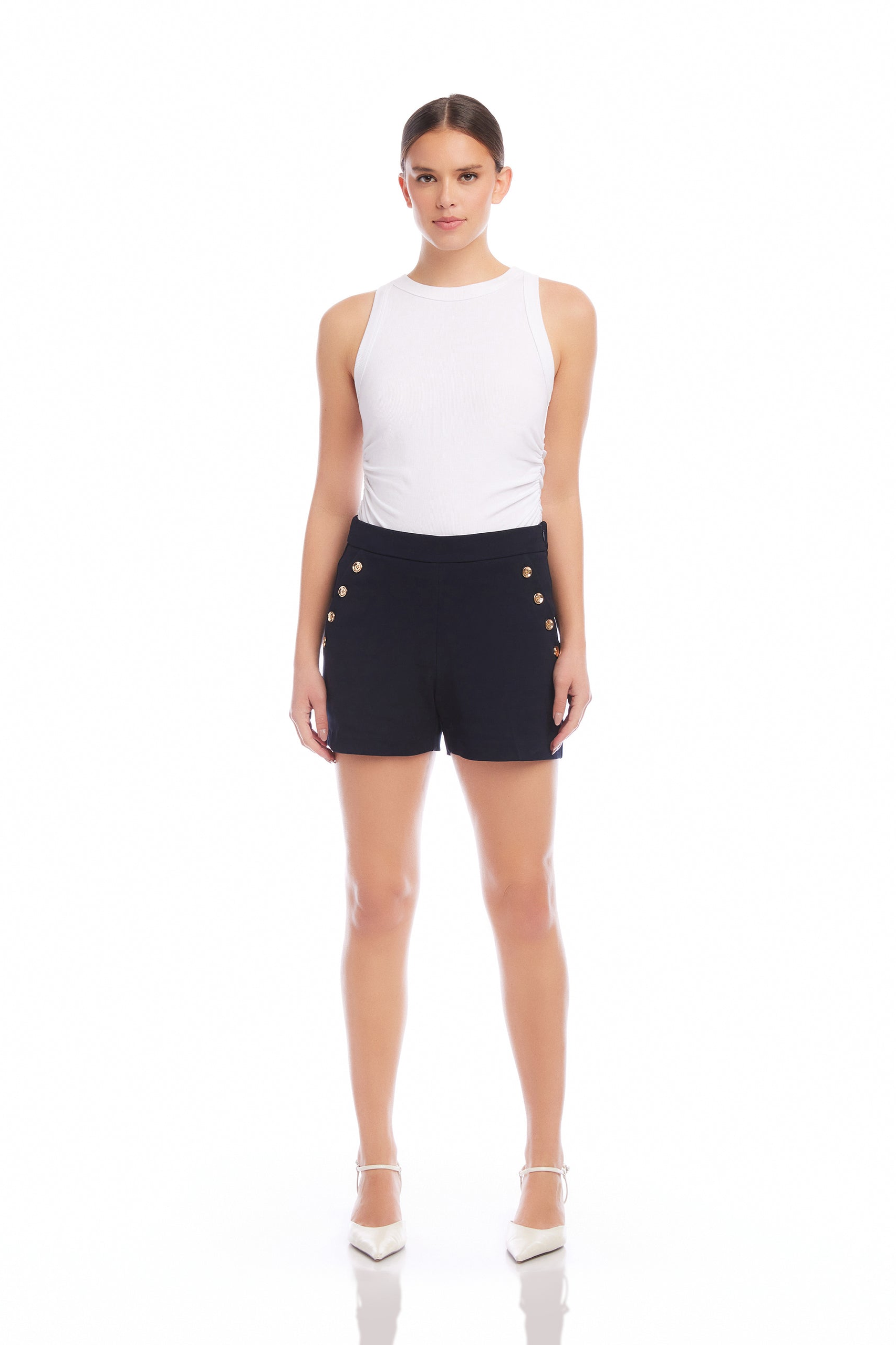Create a sophisticated and polished aesthetic with these shorts that feature faux buttons which add a timeless touch, bringing a classic charm. A premium blend of double stretch twill, viscose, cotton, and spandex not only ensures a soft and comfortable feel but also provides durability for long-lasting wear. The tailored fit flatters your silhouette, making these shorts a versatile choice for various settings.
