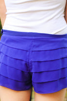 Our "Brooke Shorts" are blue, featuring ruffles and a no-show side zipper. They are lined and are 100% polyester. Our model is 5'2" and is wearing a small. Small (2/4), Medium (6), Large (8/10)