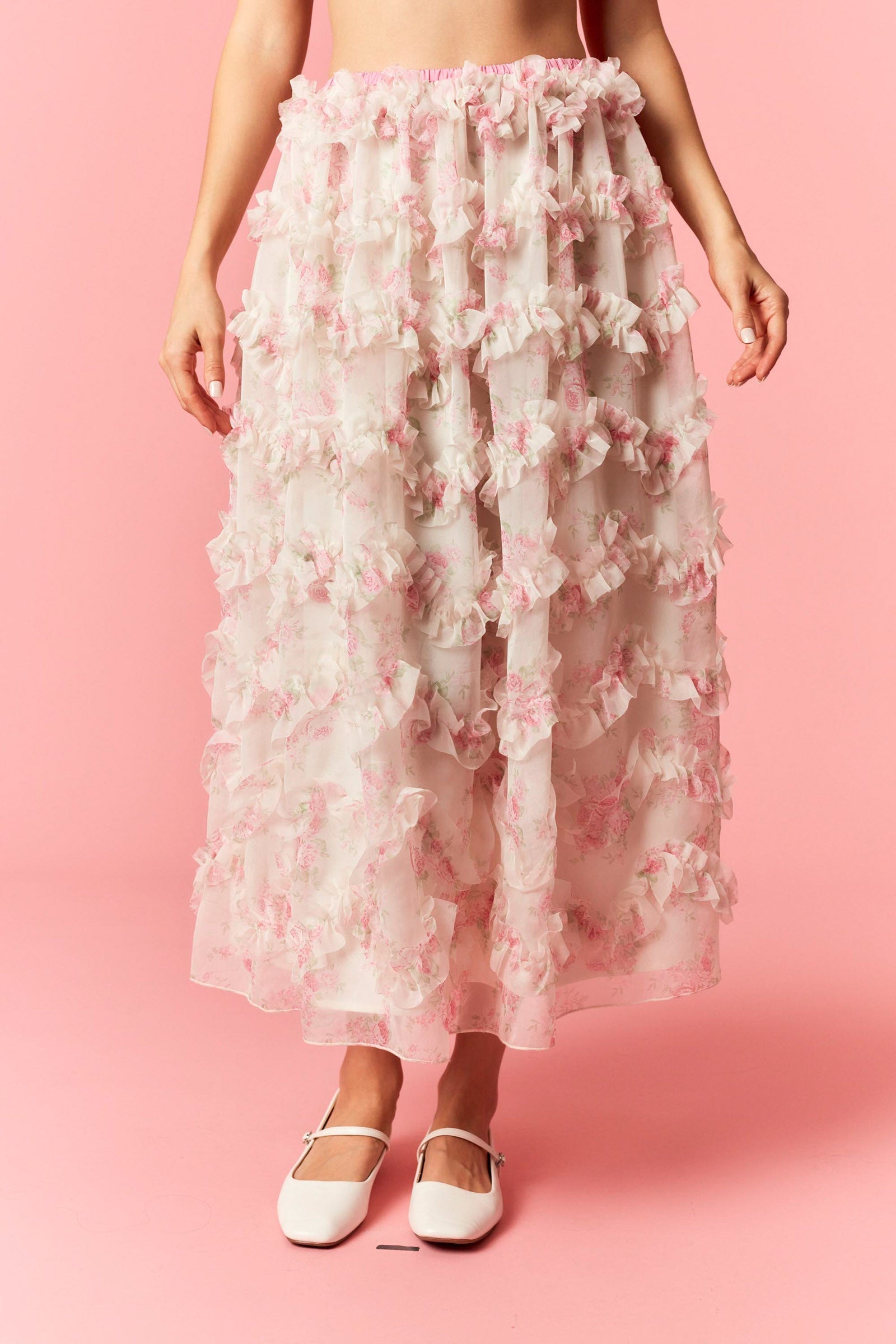 Twirl through your day in this enchanting organza maxi skirt, where delicate floral prints dance across layers of airy ruffles. The voluminous silhouette creates effortless movement and romantic flair, perfect for garden parties, weekend adventures, or whenever you want to feel like the main character. Lightweight and breathable, this dreamy piece transitions seamlessly from brunch to sunset strolls. Embrace your inner romantic with a skirt that's as fun to wear as it is to show off.