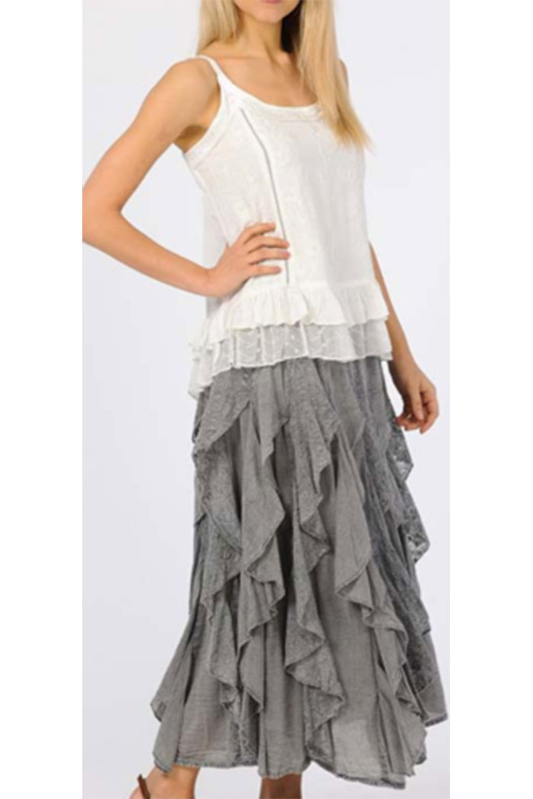 An alluring, oh so feminine skirt. Alternating ruffles of lace and solid soft gray fall gracefully to the hemline. This skirt makes an enchanting statement. Foldover waist panel measures 8" wide. Can also be worn as a strapless dress. 100% Cotton. Hand wash. Made in India. Measurements: Small Medium Large X-Large Waist: 30"-34" 32"-36" 34"-38" Length: 33" 34" 35" (waistband folded over 3")