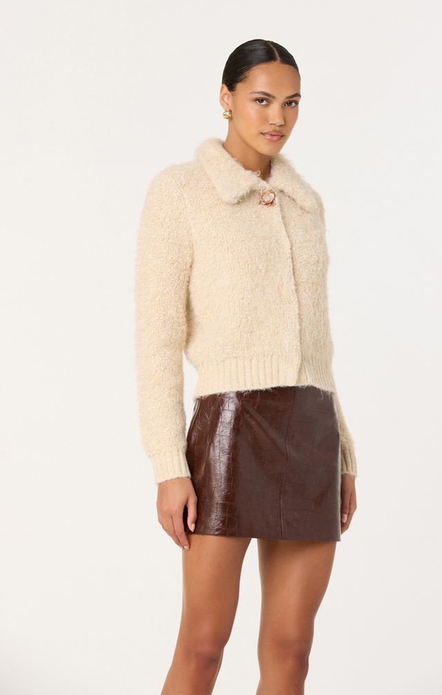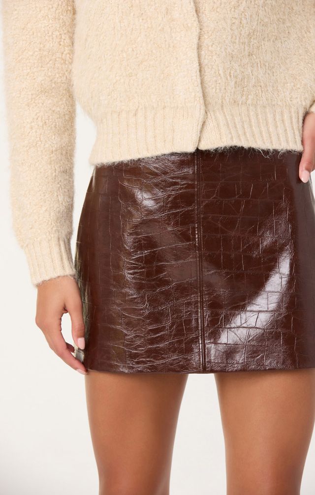 This statement skirt is crafted from a high-shine deep brown faux leather, embossed with a crocodile pattern that catches the light beautifully. The rich, luxurious tone of the chocolate brown makes it an incredibly versatile piece for the cooler months. Pair it with a cozy oversized knit and knee-high boots for a perfect autumnal ensemble, or dress it up with a silky blouse and heels for a night out.