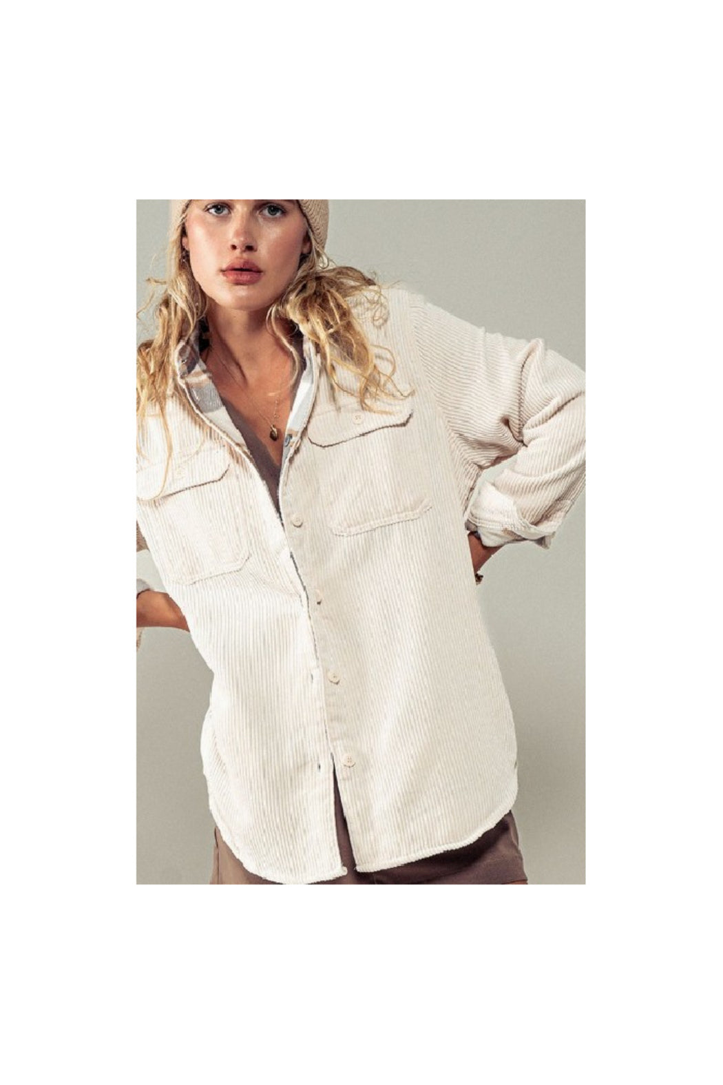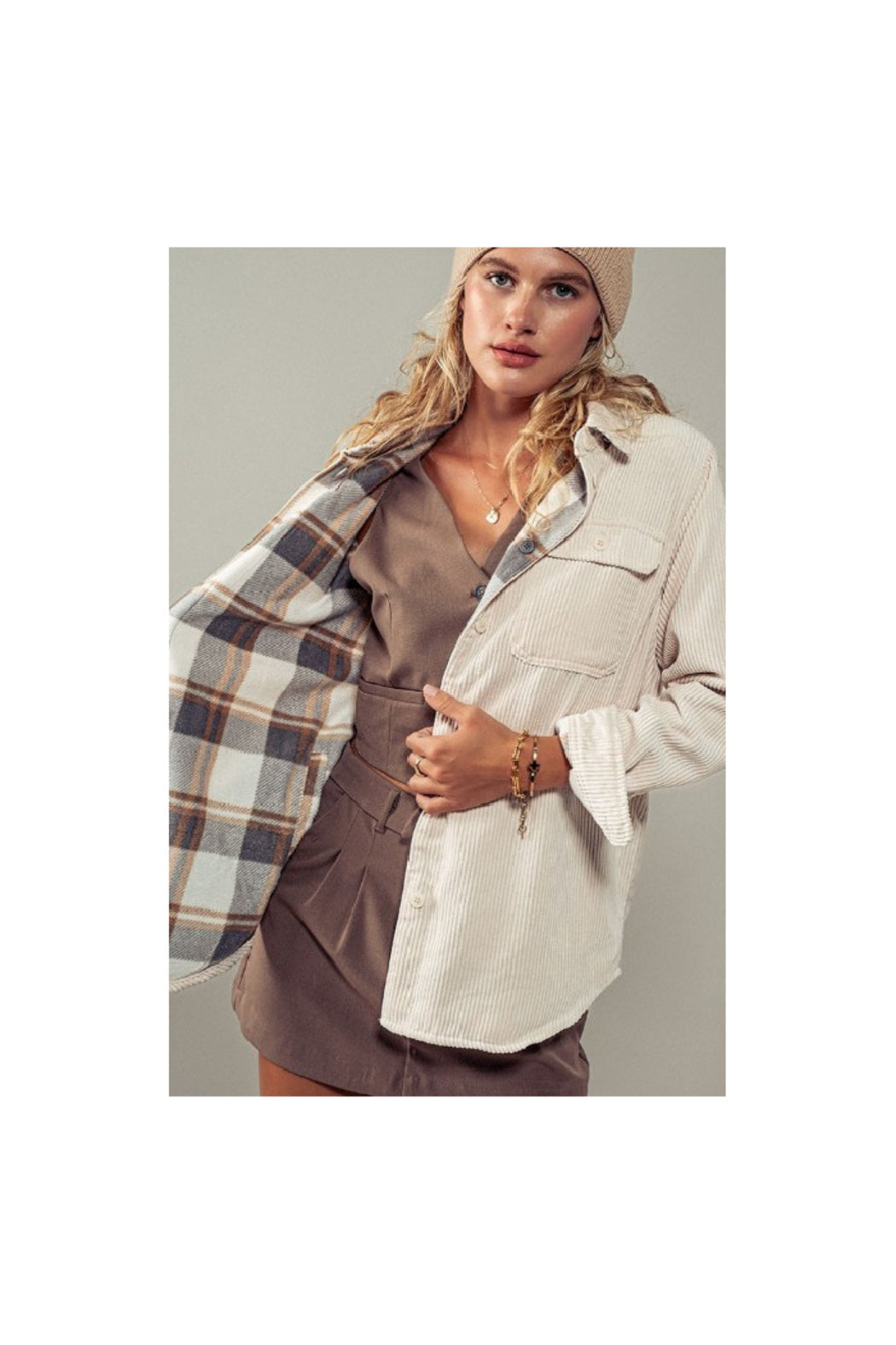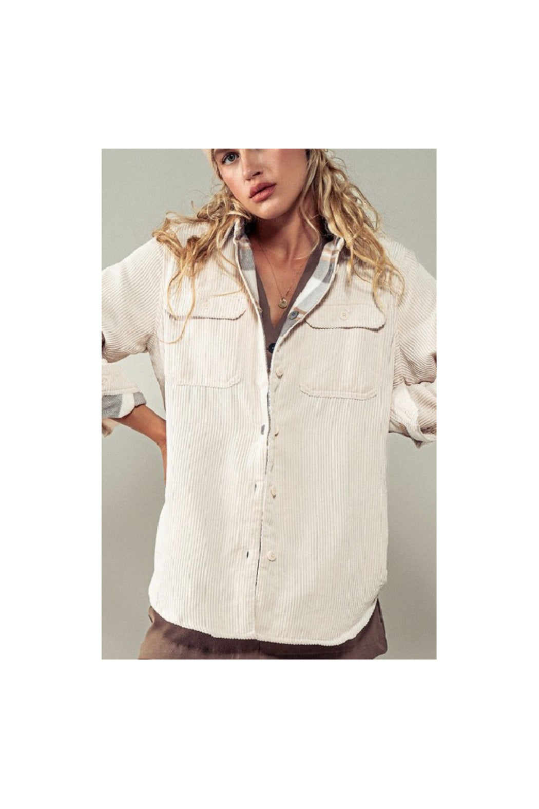 Stay cozy and cool-weather ready with this oversized corduroy shacket, lined in ultra-soft plaid fleece. Featuring a button-up front, front pocket detail, and a relaxed fit, it’s perfect for layering over basics or graphic tees.