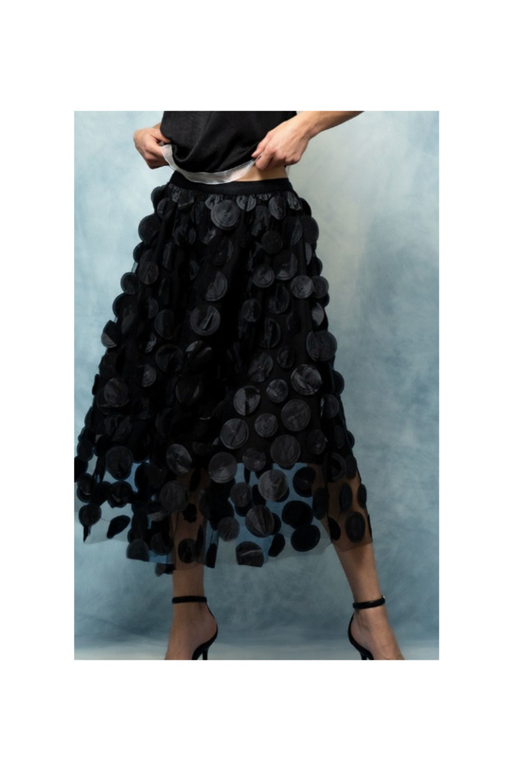A whimsical midi skirt featuring dimensional polka dot appliques on sheer black tulle. The elastic waistband and layered construction create a romantic silhouette perfect for special occasions. Features: • 100% Polyester • S-L: 2-2-2 • Elastic waistband design • polka dot texture • Layered tulle construction • Mid-calf length