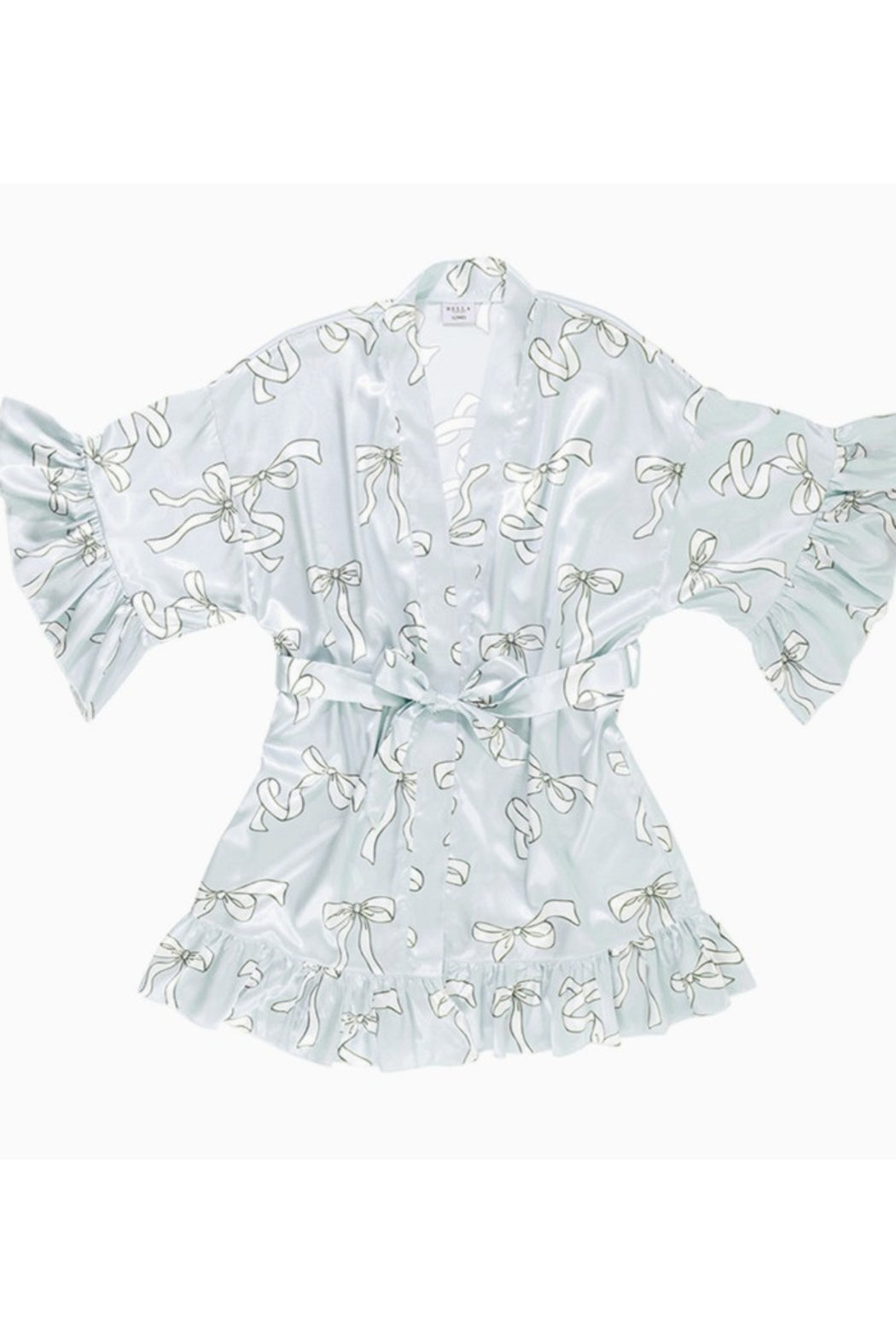 Delicate ruffled trim adds a romantic flair, while the soft blue bow print brings a playful, vintage-inspired elegance. Whether you're getting ready, winding down, or simply indulging in some self-care, this robe makes every moment feel special.