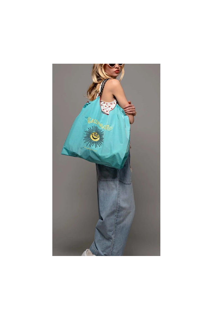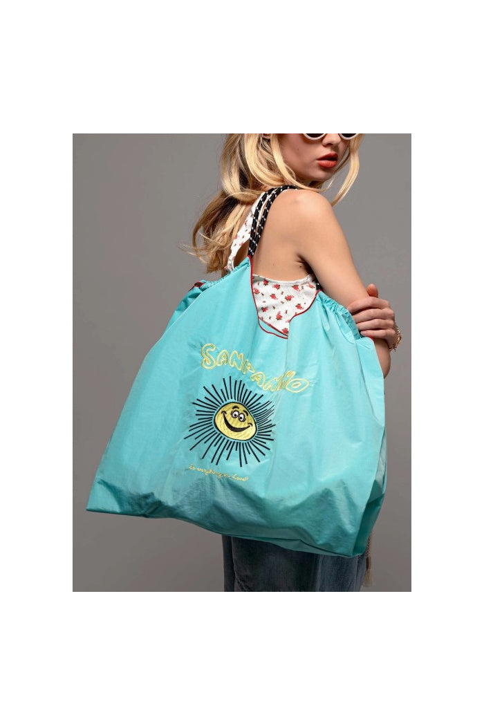This oversized tote bag features a whimsical sun graphic and "San Paolo" text. Crafted from durable nylon, it includes a drawstring closure, rope handle detail, and ample carrying capacity for effortless style and functionality. • 100% Nylon • Sunshine graphic design for bold appeal • Rope handle detail for added charm • Oversized carrying capacity for practicality
