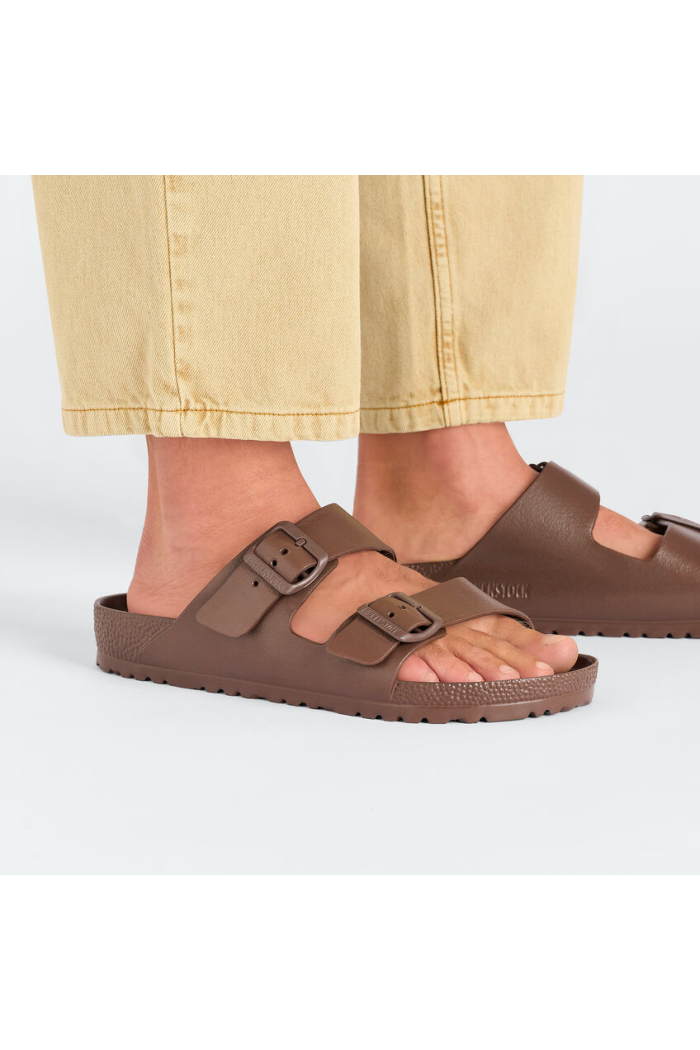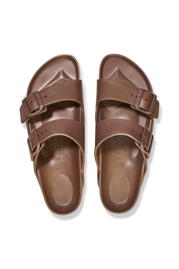 The legendary two-strap design from BIRKENSTOCK - the Arizona. Modeled on the cork original, this sandal is made from ultra lightweight and highly flexible EVA. These sandals are shock absorbing, waterproof, and skin-friendly. Wear them at the beach, in the garden, or around the gym and after workouts. It's the perfect addition to your classic BIRKENSTOCK sandals. Anatomically shaped BIRKENSTOCK footbed made from EVA Upper/lining/sole: one piece molded EVA Details: two straps, each with an individually adjustable pin buckle; waterproof, washable, ultra lightweight “Made in Germany”