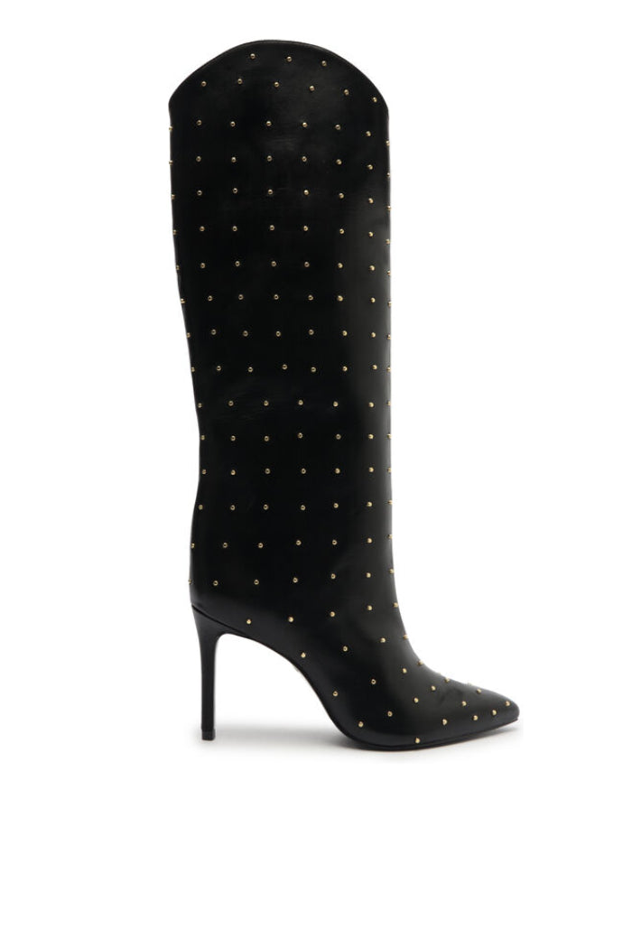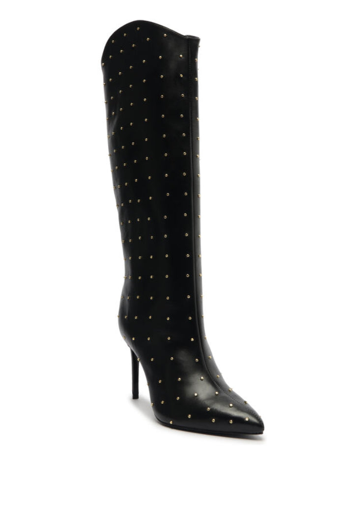 Tiny studs punctuate the towering profile of a pointy-toe boot with a slender heel and curved topline. 3 1/2" heel Leather upper/synthetic lining/leather sole Imported