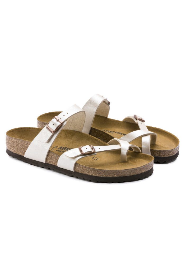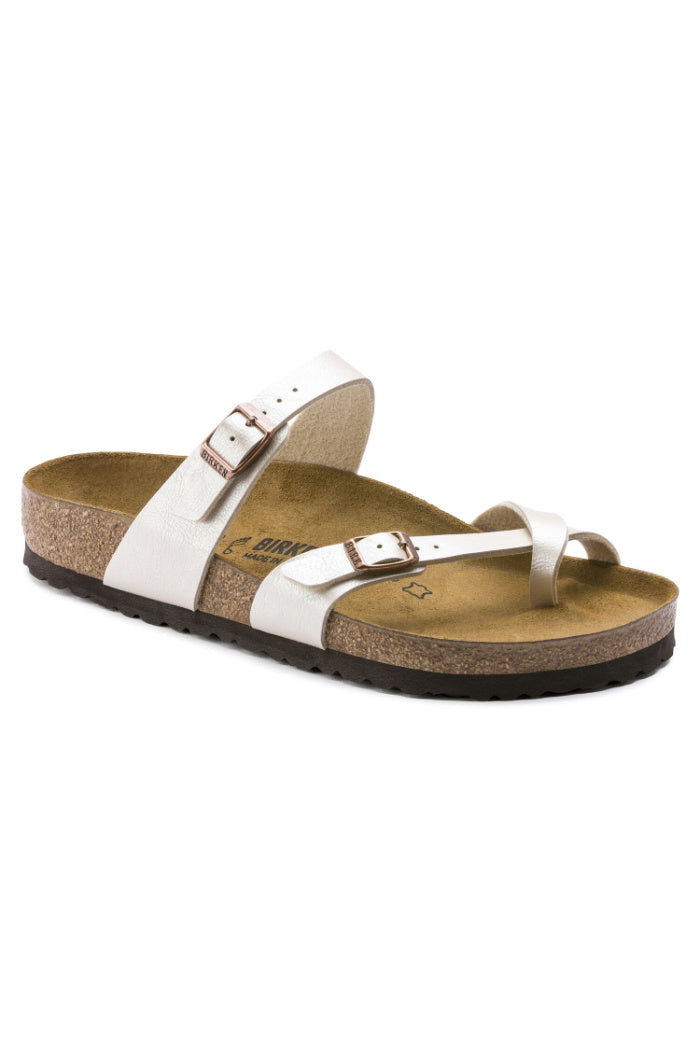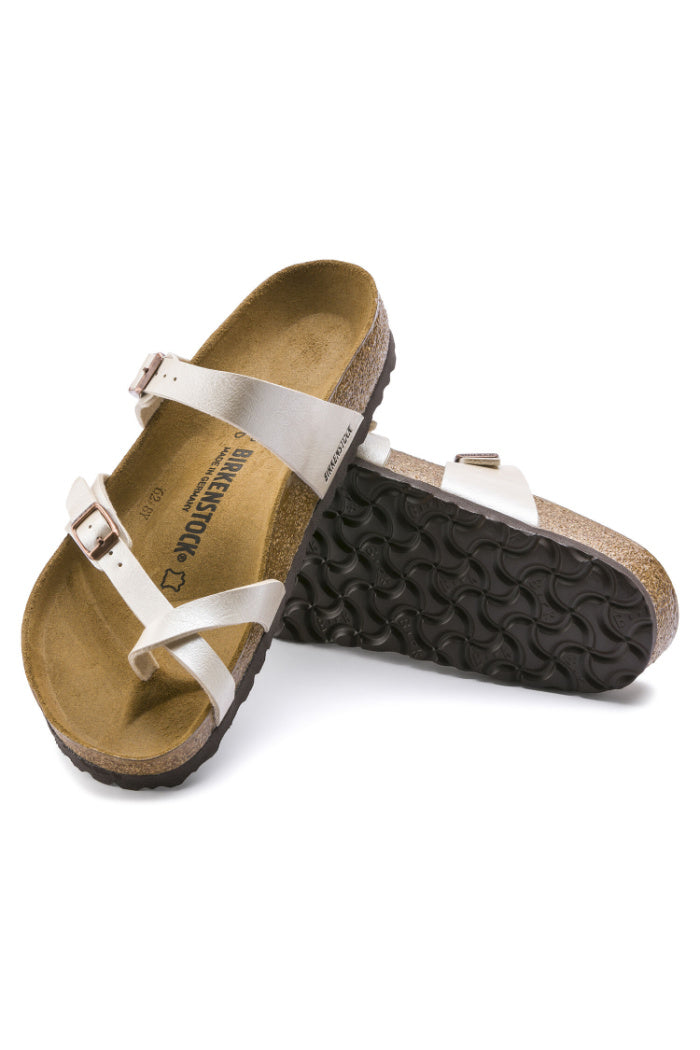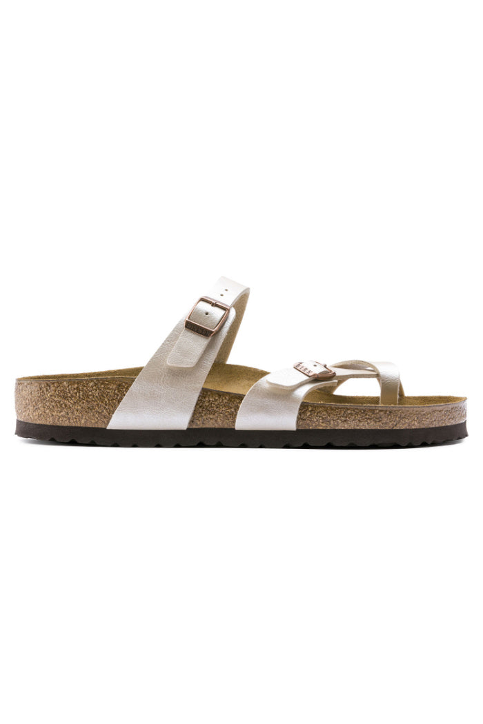 Crisscross straps with a special shimmer, the Mayari sandal dresses for RSVP season in our signature material. Designed on an original contoured footbed for last-to-leave support. Contoured cork-latex footbed creates custom support with wear Shimmery Birko-Flor® synthetic leather upper Suede footbed lining helps keep you comfortable Flexible EVA sole Two straps with adjustable metal pin buckles Made in Germany