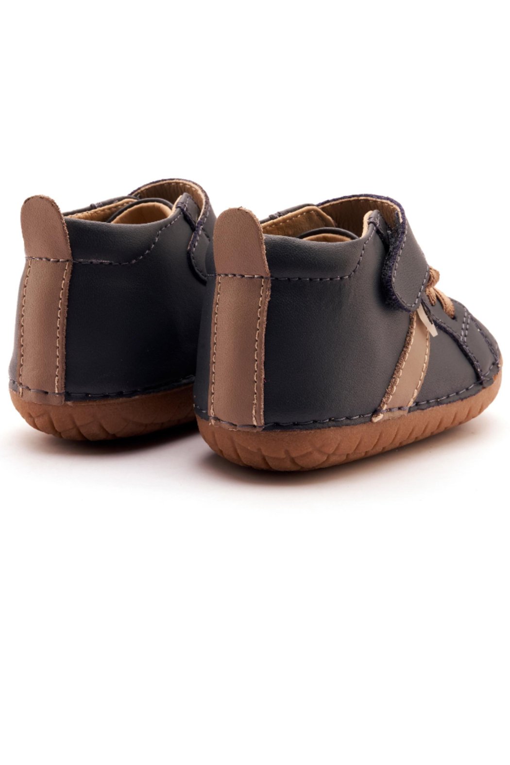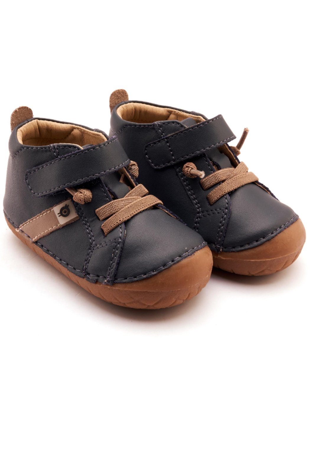 Step out in style with the Old Soles Boy's Roadway Pave Casual Shoes in navy blue with a taupe stripe. These sneakers feature matching taupe elastic laces that never need tying, plus a top hook and loop closure for easy on and off. The thin rubber sole with a bump toe offers flexible comfort and durable traction, perfect for all-day play and adventures.