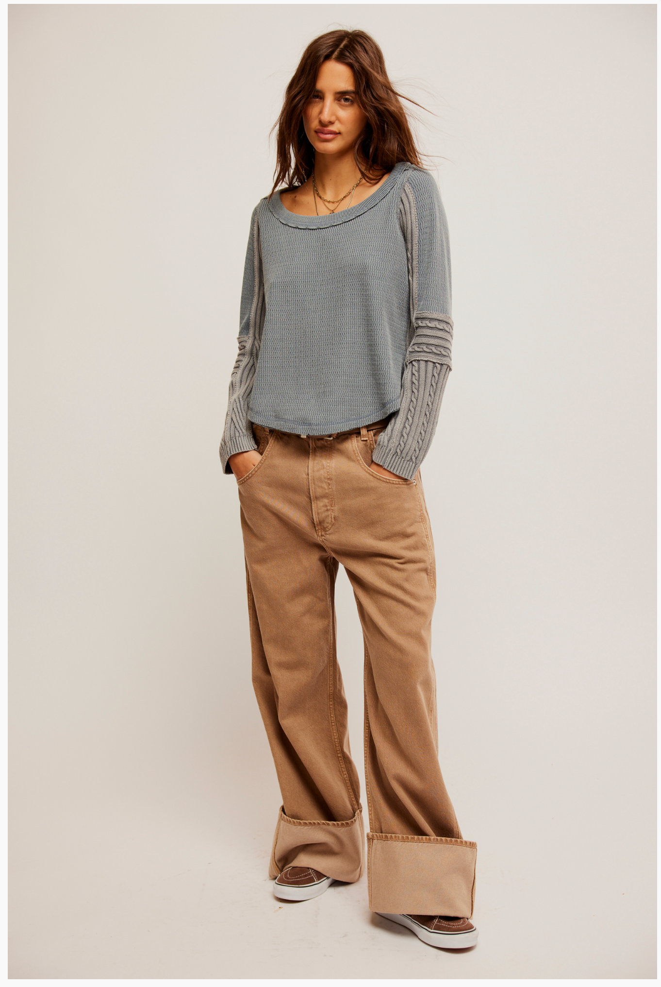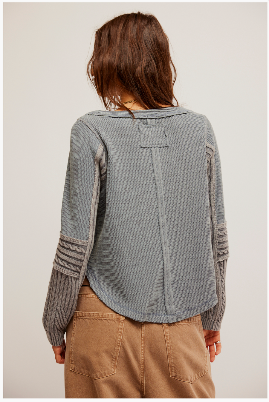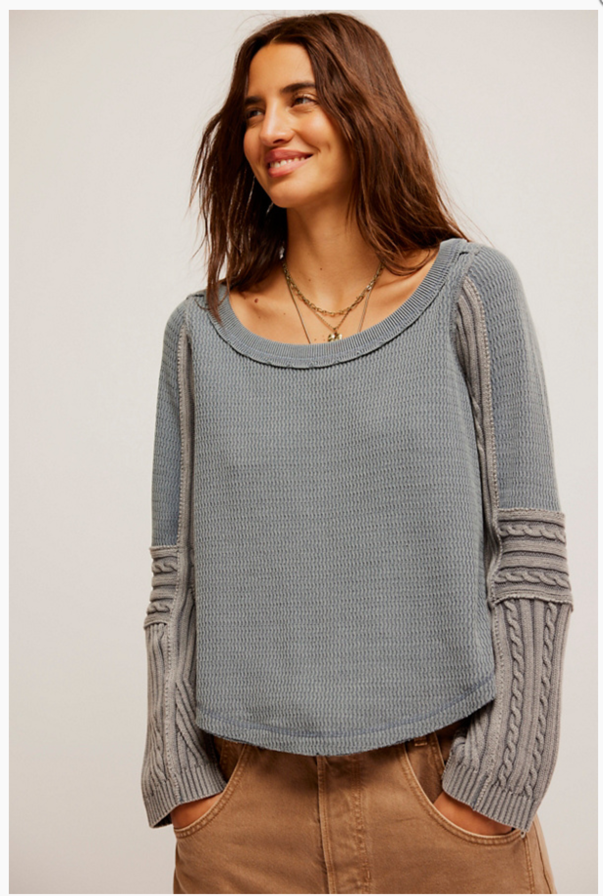 Introducing the Free People Singing Cable Cuff Weathervane Combo. Add texture to your everyday look with this waffle knit and cable detailed top. Perfect for a relaxed, effortless vibe with rolled sleeves and raw hem. Elevate your style with ease.