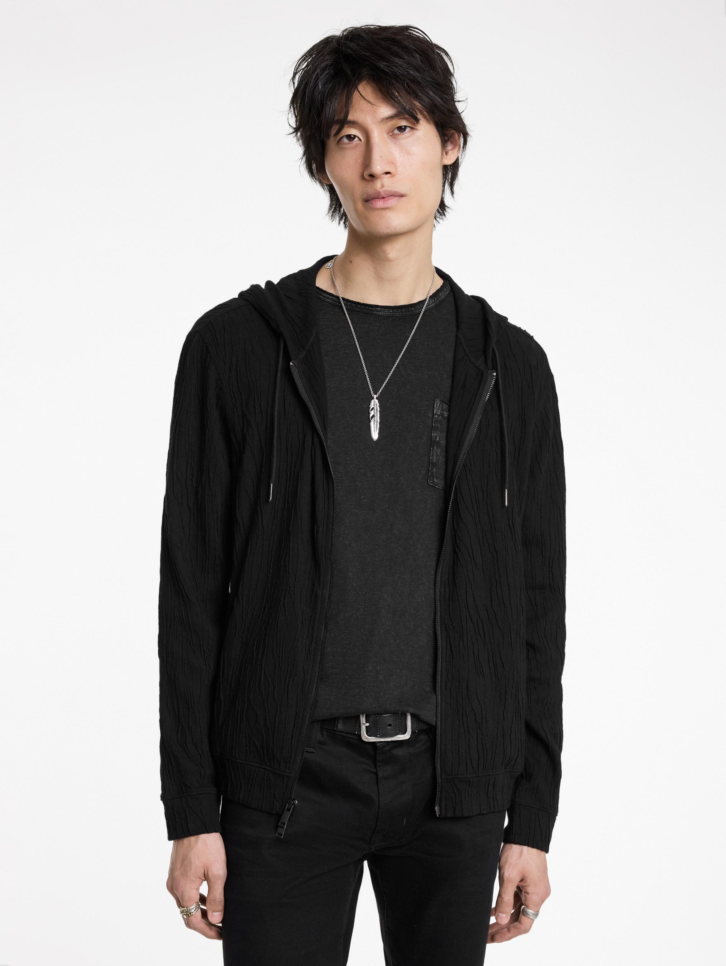 Experience quiet luxury with the John Varvatos Ihsan Hoodie. The jacquard fabric offers a unique tactile experience while the metal double zipper adds a touch of edge. Adjust the fit with signature metal aglets and keep your essentials close in the practical single welt pockets. Elevate any outfit effortlessly.